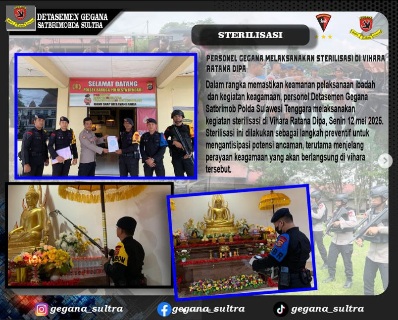 Kendari – Menjelang peringatan Hari Raya Waisak 2569 BE tahun 2025, Detasemen Gegana Satuan Brimob Polda Sulawesi Tenggara melaksanakan kegiatan sterilisasi di sejumlah tempat ibadah umat Buddha di Kota Kendari. Tiga vihara yang menjadi fokus pengamanan yakni Vihara Eka Dharma Manggala, Vihara Ratana Dipa, dan Vihara Tekad Maitreya.