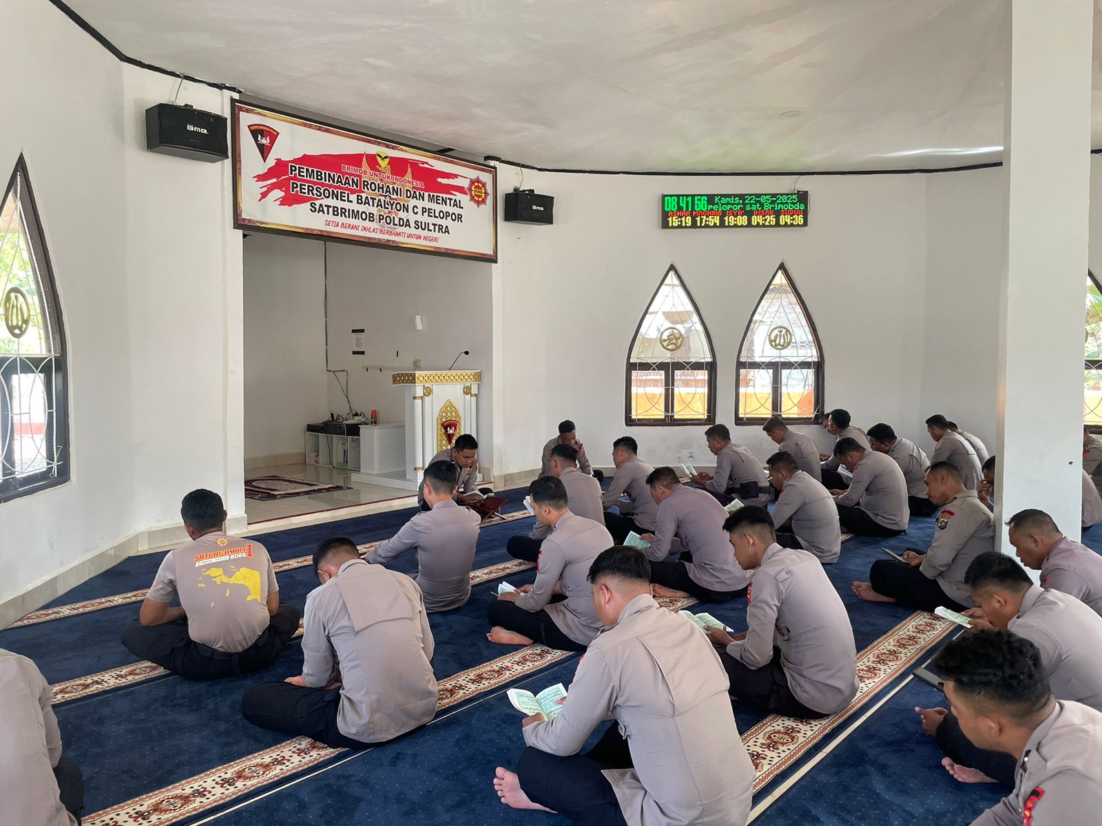 Kendari – Dalam upaya memperkuat karakter personel dan meningkatkan keimanan serta ketakwaan kepada Tuhan Yang Maha Esa, Batalyon C Pelopor Satbrimob Polda Sulawesi Tenggara kembali menggelar kegiatan Pembinaan Rohani dan Mental (Binrohtal) yang berlangsung di Masjid At-Taqwa Mako Batalyon C Pelopor, Kamis (22/05).