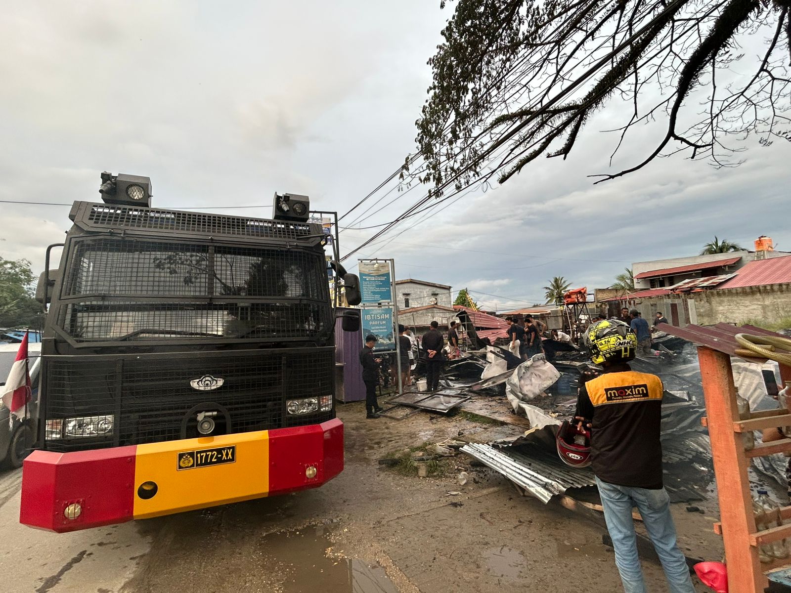 “Begitu mendapat informasi tentang kebakaran, kami langsung menurunkan dua unit kendaraan water cannon dan beberapa personel ke lokasi untuk membantu tim pemadam kebakaran dalam upaya pemadaman api dan mencegah meluasnya kobaran ke bangunan lain,” ujar Kompol Alwi.