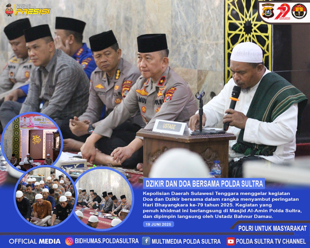 Kendari – Kepolisian Daerah Sulawesi Tenggara (Polda Sultra) menggelar kegiatan Doa dan Dzikir bersama dalam rangka menyambut peringatan Hari Bhayangkara ke-79 tahun 2025. Kegiatan yang penuh khidmat ini berlangsung di Masjid Al-Amin Polda Sultra, pada Kamis, 19 Juni 2025, dan dipimpin langsung oleh Ustadz Bahnur Damau.