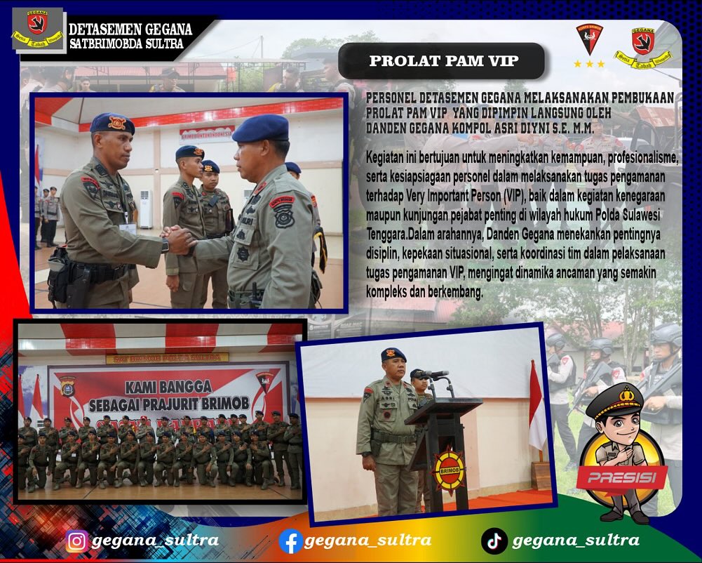 Kendari – Dalam rangka meningkatkan kemampuan dan kesiapsiagaan personel dalam pengamanan Very Very Important Person (VVIP), Detasemen Gegana Satbrimob Polda Sulawesi Tenggara menggelar Program Latihan (Prolat) Kemampuan VVIP. Upacara pembukaan latihan ini dilaksanakan pada Senin, 16 Juni 2025, dan dipimpin langsung oleh Komandan Detasemen Gegana, Kompol Asri Diyni, S.E., M.M.