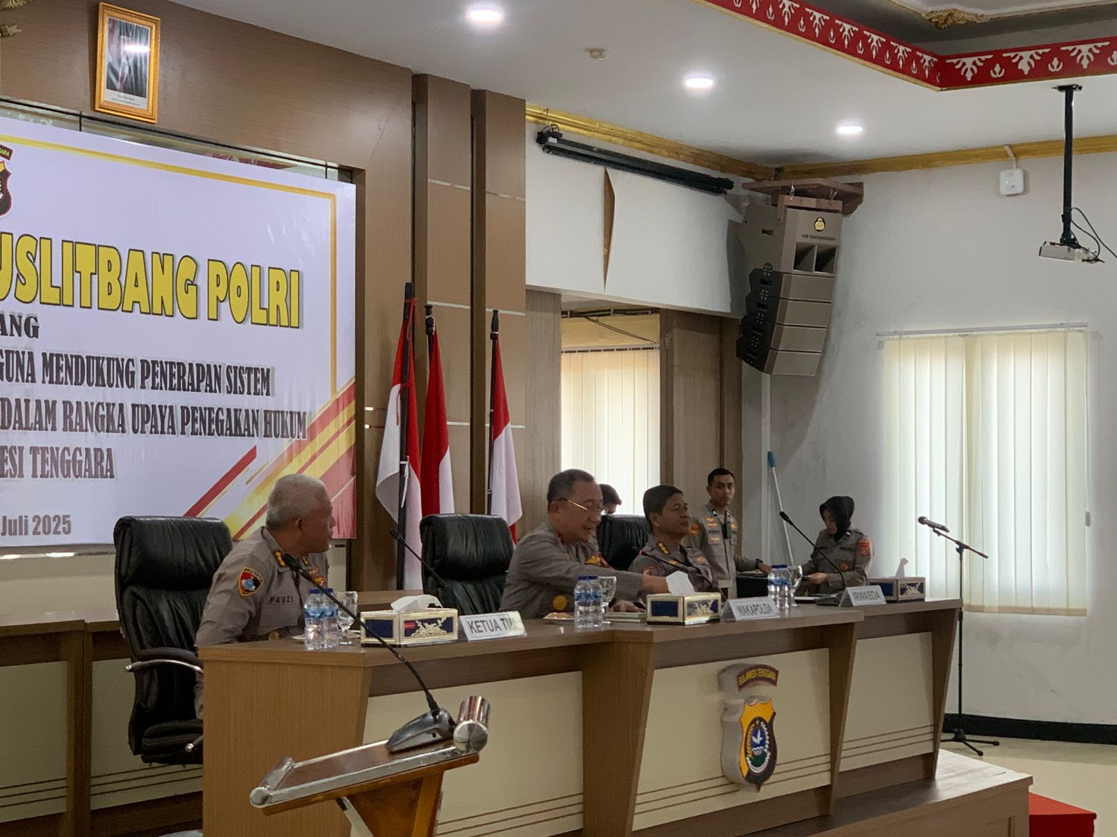 Kegiatan ini dipimpin langsung oleh Wakapolda Sultra, Brigjen Pol Amur Chandra Juli Buana, S.H., M.H., dan turut dihadiri oleh Irwasda Polda Sultra Kombes Pol Hartoyo, para pejabat utama Polda Sultra, serta jajaran tim dari Puslitbang Polri.