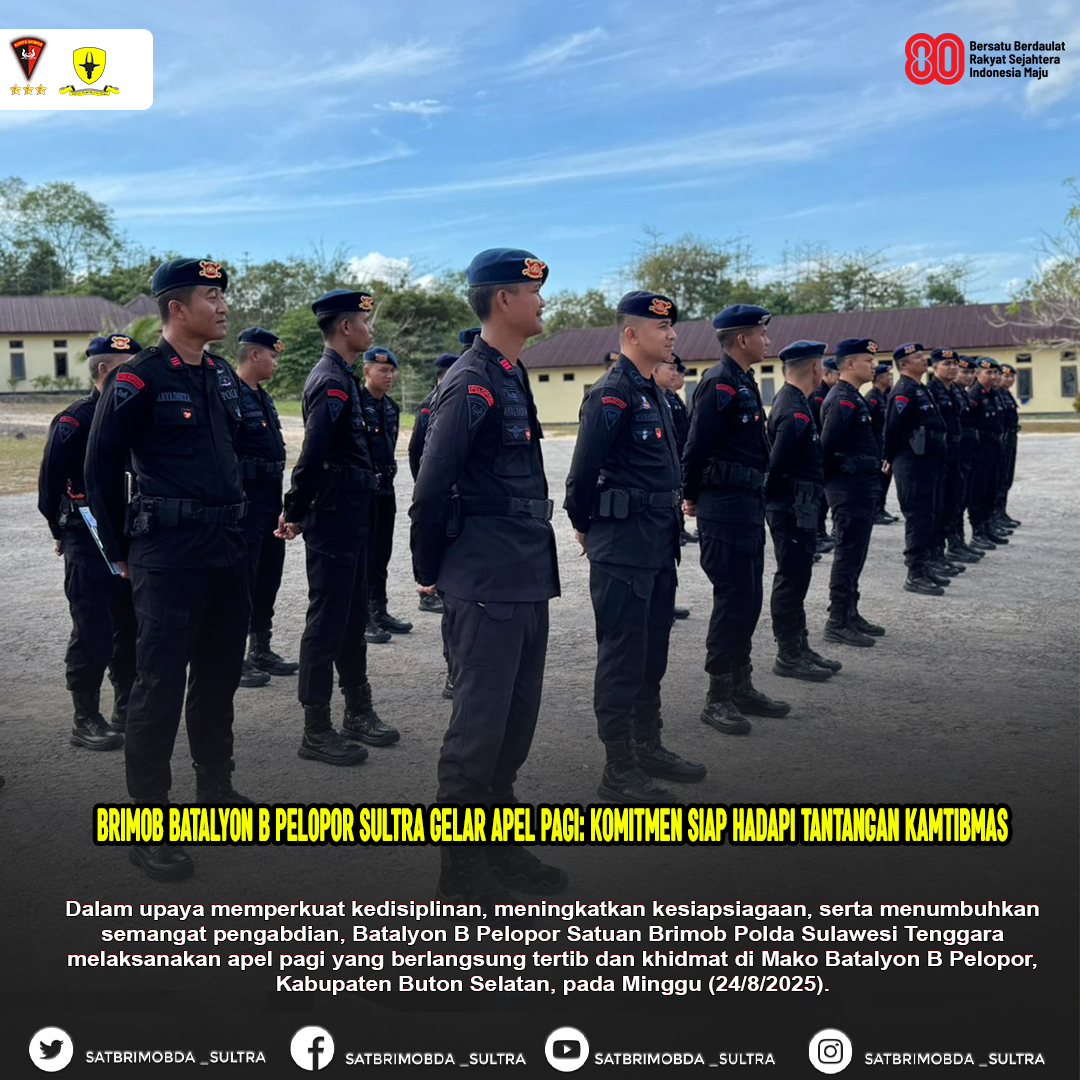 Dengan apel yang terstruktur, konsisten, dan berbasis pembinaan karakter, Batalyon B Pelopor Satbrimob Polda Sultra menegaskan eksistensinya sebagai satuan elite yang siap merespons tantangan zaman dengan prinsip profesional, modern, dan terpercaya.