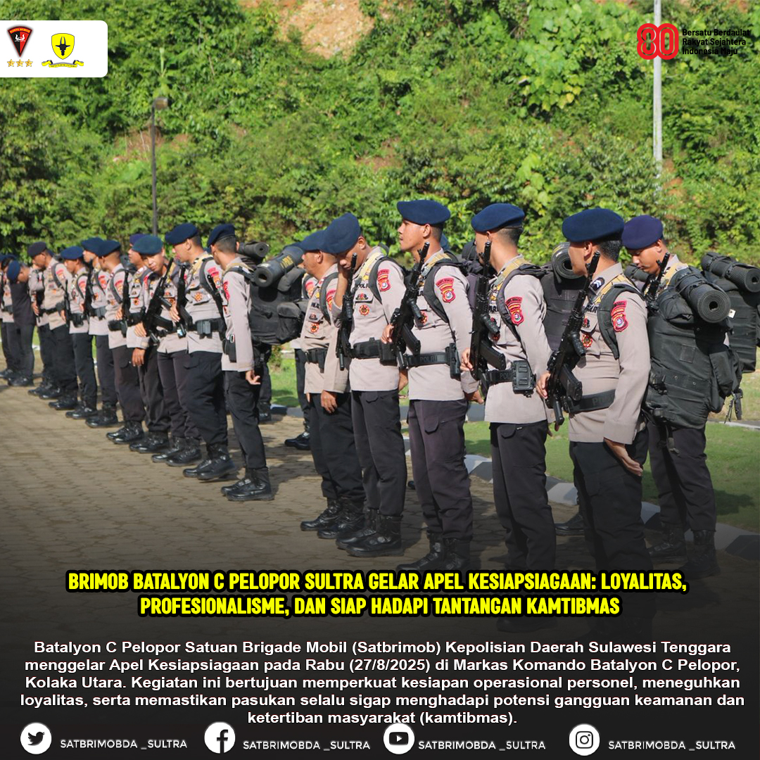 Kolaka Utara – Batalyon C Pelopor Satuan Brigade Mobil (Satbrimob) Kepolisian Daerah Sulawesi Tenggara menggelar Apel Kesiapsiagaan pada Rabu (27/8/2025) di Markas Komando Batalyon C Pelopor, Kolaka Utara. Kegiatan ini bertujuan memperkuat kesiapan operasional personel, meneguhkan loyalitas, serta memastikan pasukan selalu sigap menghadapi potensi gangguan keamanan dan ketertiban masyarakat (kamtibmas).