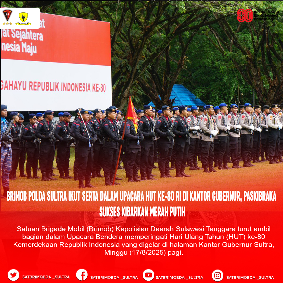Kendari – Satuan Brigade Mobil (Brimob) Kepolisian Daerah Sulawesi Tenggara turut ambil bagian dalam Upacara Bendera memperingati Hari Ulang Tahun (HUT) ke-80 Kemerdekaan Republik Indonesia yang digelar di halaman Kantor Gubernur Sultra, Minggu (17/8/2025) pagi.