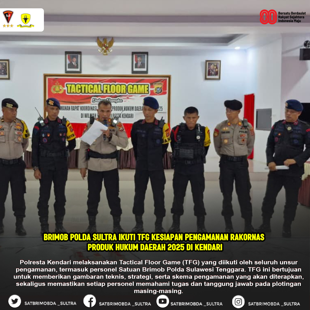 Sebagai salah satu bentuk kesiapan, Polresta Kendari melaksanakan Tactical Floor Game (TFG) yang diikuti oleh seluruh unsur pengamanan, termasuk personel Satuan Brimob Polda Sulawesi Tenggara. TFG ini bertujuan untuk memberikan gambaran teknis, strategi, serta skema pengamanan yang akan diterapkan, sekaligus memastikan setiap personel memahami tugas dan tanggung jawab pada plotingan masing-masing.