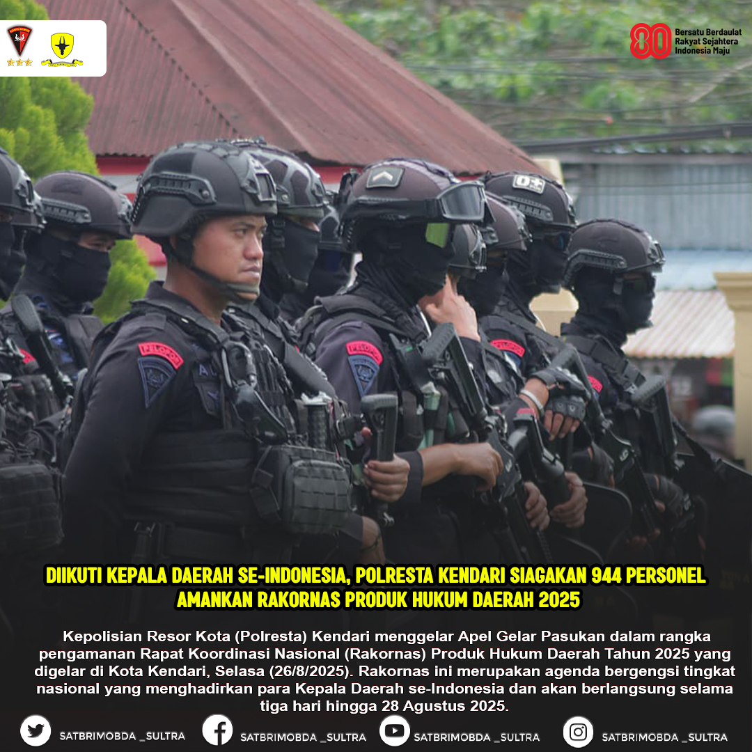 Kendari, Sultra Kepolisian Resor Kota (Polresta) Kendari menggelar Apel Gelar Pasukan dalam rangka pengamanan Rapat Koordinasi Nasional (Rakornas) Produk Hukum Daerah Tahun 2025 yang digelar di Kota Kendari, Selasa (26/8/2025).