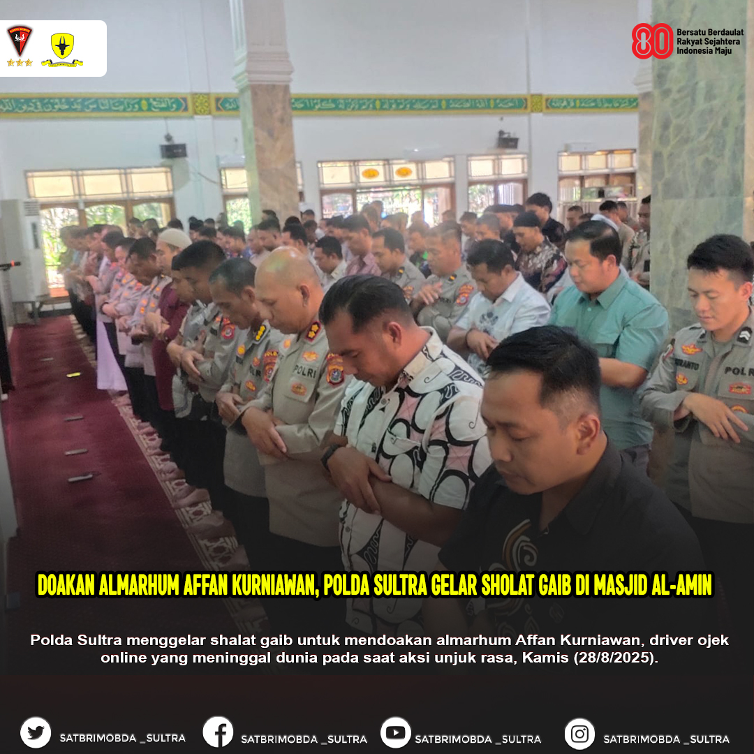 Kendari Polda Sultra menggelar shalat gaib untuk mendoakan almarhum Affan Kurniawan, driver ojek online yang meninggal dunia pada saat aksi unjuk rasa, Kamis (28/8/2025).