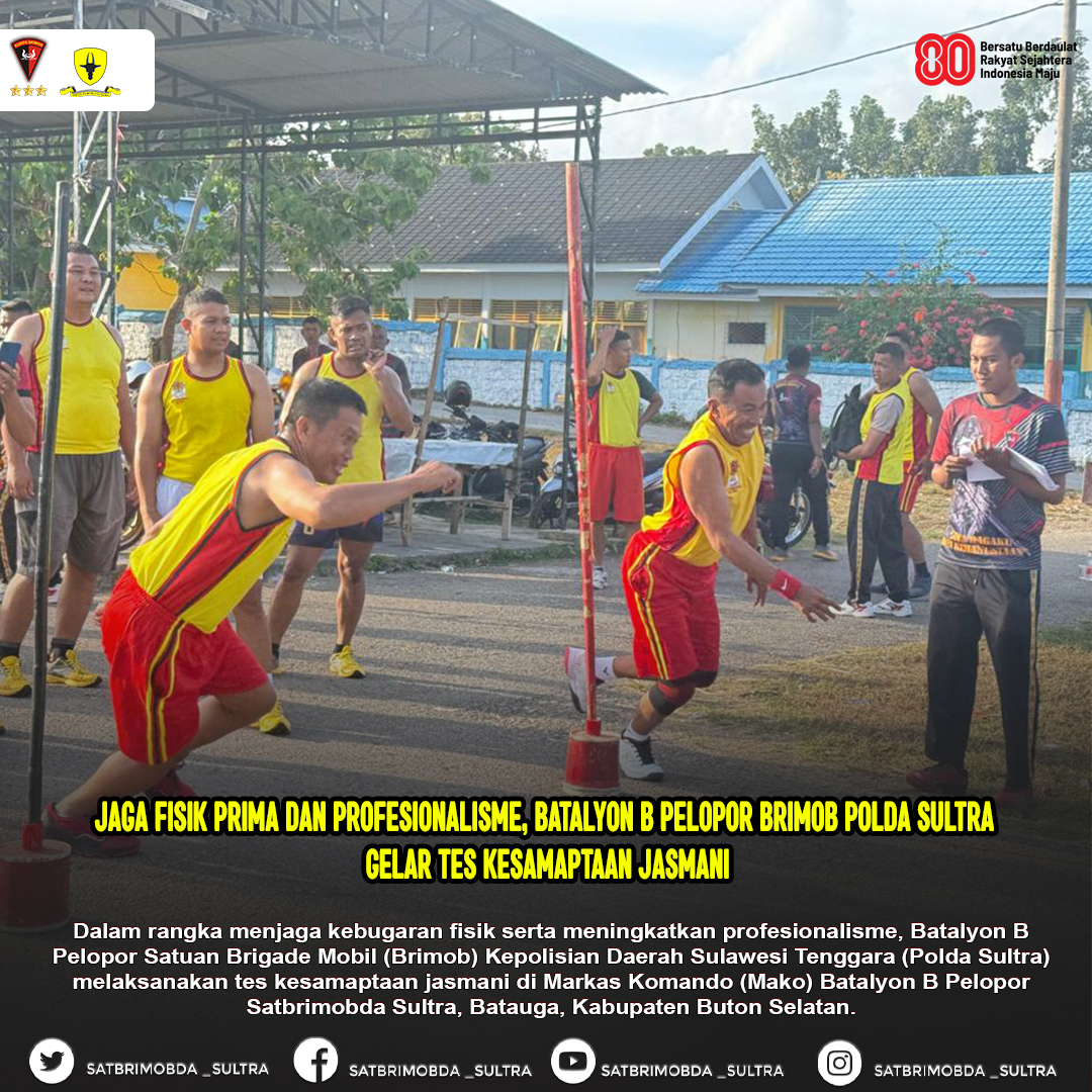 Buton Selatan – Dalam rangka menjaga kebugaran fisik serta meningkatkan profesionalisme, Batalyon B Pelopor Satuan Brigade Mobil (Brimob) Kepolisian Daerah Sulawesi Tenggara (Polda Sultra) melaksanakan tes kesamaptaan jasmani di Markas Komando (Mako) Batalyon B Pelopor Satbrimobda Sultra, Batauga, Kabupaten Buton Selatan.