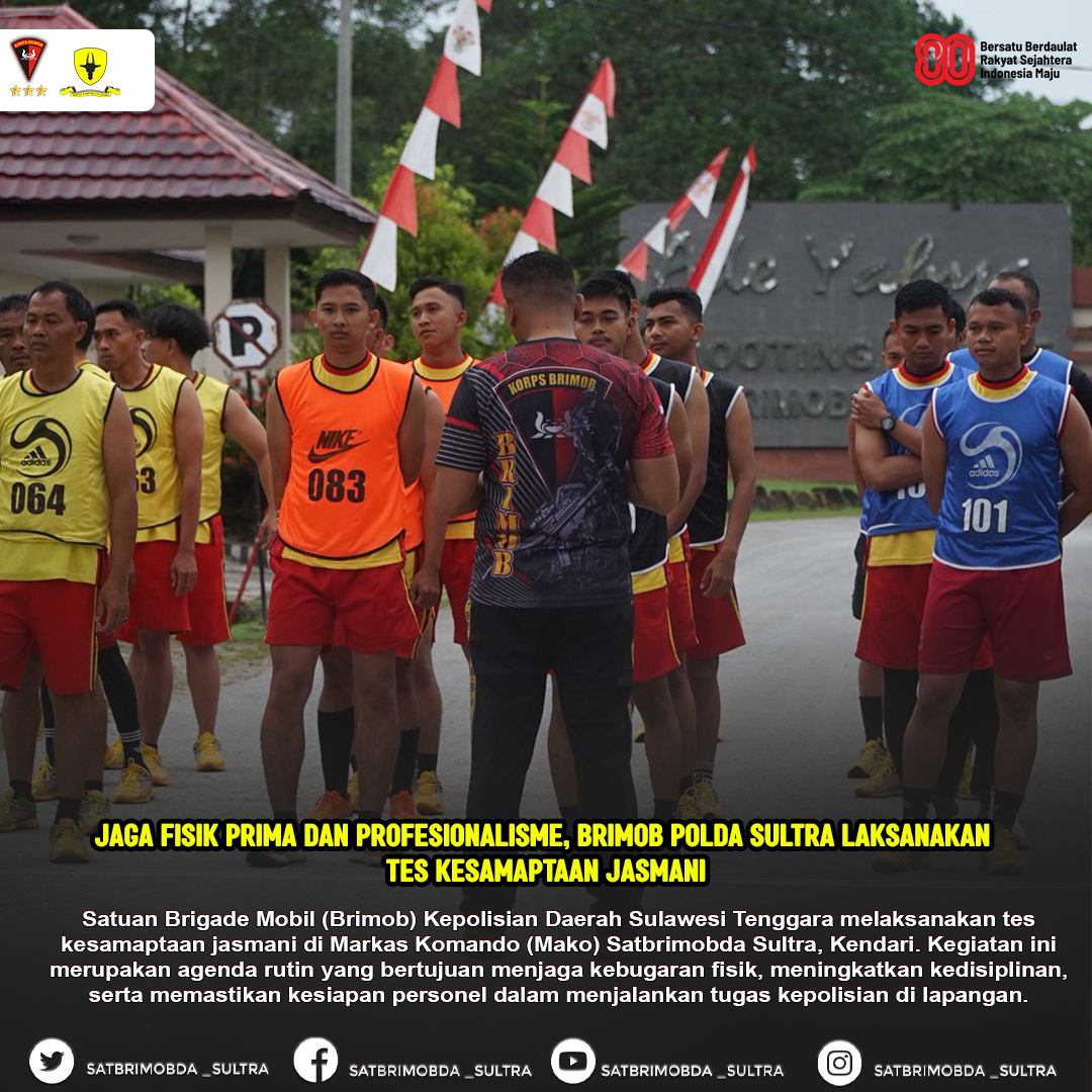 Kendari – Satuan Brigade Mobil (Brimob) Kepolisian Daerah Sulawesi Tenggara melaksanakan tes kesamaptaan jasmani di Markas Komando (Mako) Satbrimobda Sultra, Kendari. Kegiatan ini merupakan agenda rutin yang bertujuan menjaga kebugaran fisik, meningkatkan kedisiplinan, serta memastikan kesiapan personel dalam menjalankan tugas kepolisian di lapangan.