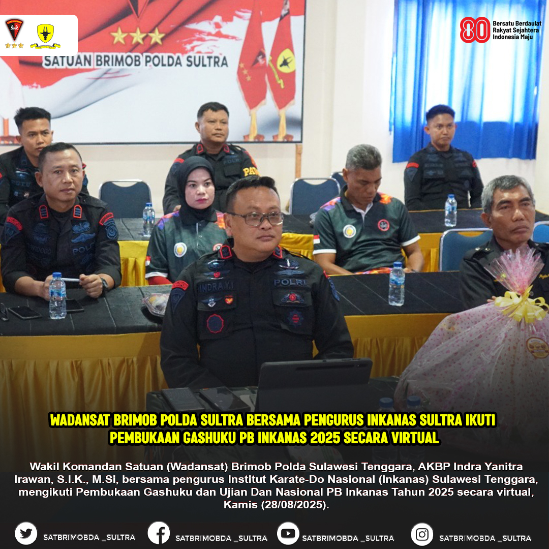 Kendari – Wakil Komandan Satuan (Wadansat) Brimob Polda Sulawesi Tenggara, AKBP Indra Yanitra Irawan, S.I.K., M.Si, bersama pengurus Institut Karate-Do Nasional (Inkanas) Sulawesi Tenggara, mengikuti Pembukaan Gashuku dan Ujian Dan Nasional PB Inkanas Tahun 2025 secara virtual, Kamis (28/08/2025).