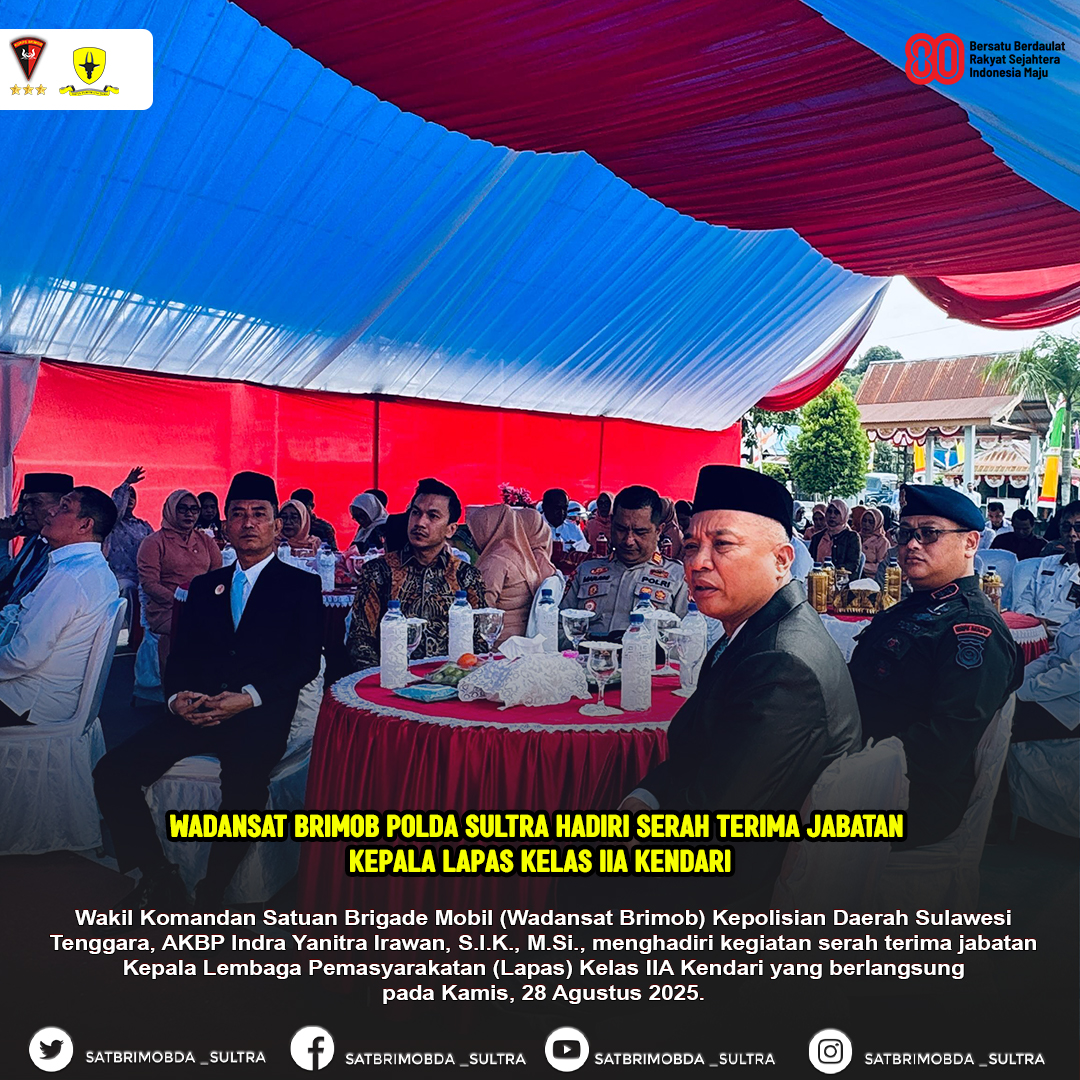 Kendari – Wakil Komandan Satuan Brigade Mobil (Wadansat Brimob) Kepolisian Daerah Sulawesi Tenggara, AKBP Indra Yanitra Irawan, S.I.K., M.Si., menghadiri kegiatan serah terima jabatan Kepala Lembaga Pemasyarakatan (Lapas) Kelas IIA Kendari yang berlangsung pada Kamis, 28 Agustus 2025.