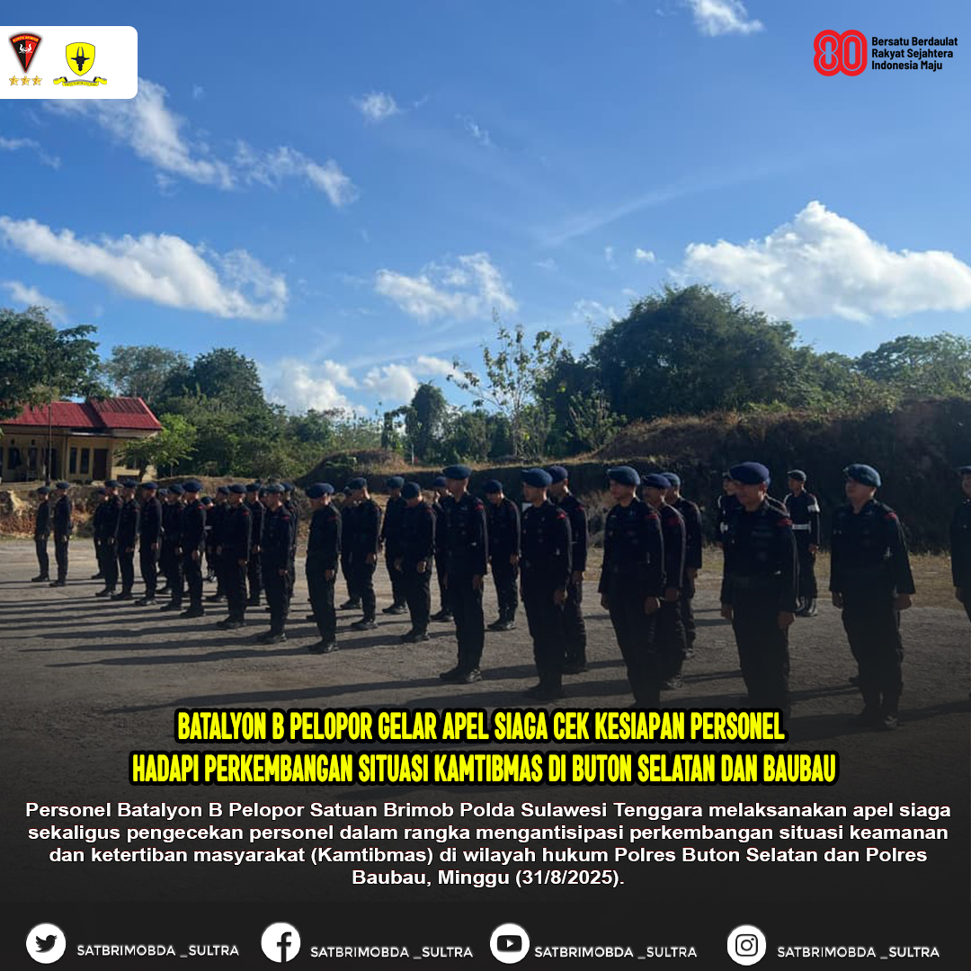 Batauga, Buton Selatan – Personel Batalyon B Pelopor Satuan Brimob Polda Sulawesi Tenggara melaksanakan apel siaga sekaligus pengecekan personel dalam rangka mengantisipasi perkembangan situasi keamanan dan ketertiban masyarakat (Kamtibmas) di wilayah hukum Polres Buton Selatan dan Polres Baubau, Minggu (31/8/2025).