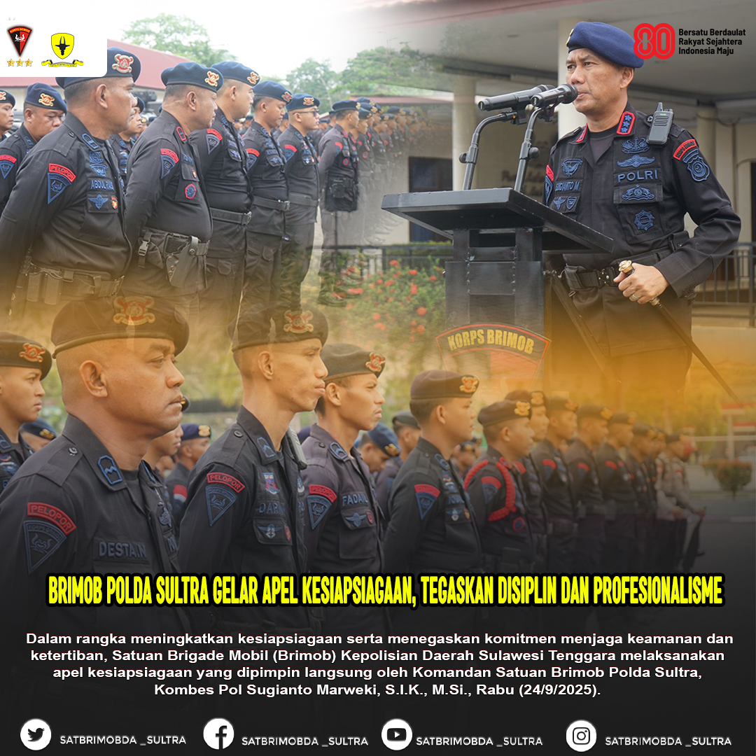 Kendari, – Dalam rangka meningkatkan kesiapsiagaan serta menegaskan komitmen menjaga keamanan dan ketertiban, Satuan Brigade Mobil (Brimob) Kepolisian Daerah Sulawesi Tenggara melaksanakan apel kesiapsiagaan yang dipimpin langsung oleh Komandan Satuan Brimob Polda Sultra, Kombes Pol Sugianto Marweki, S.I.K., M.Si., Rabu (24/9/2025).