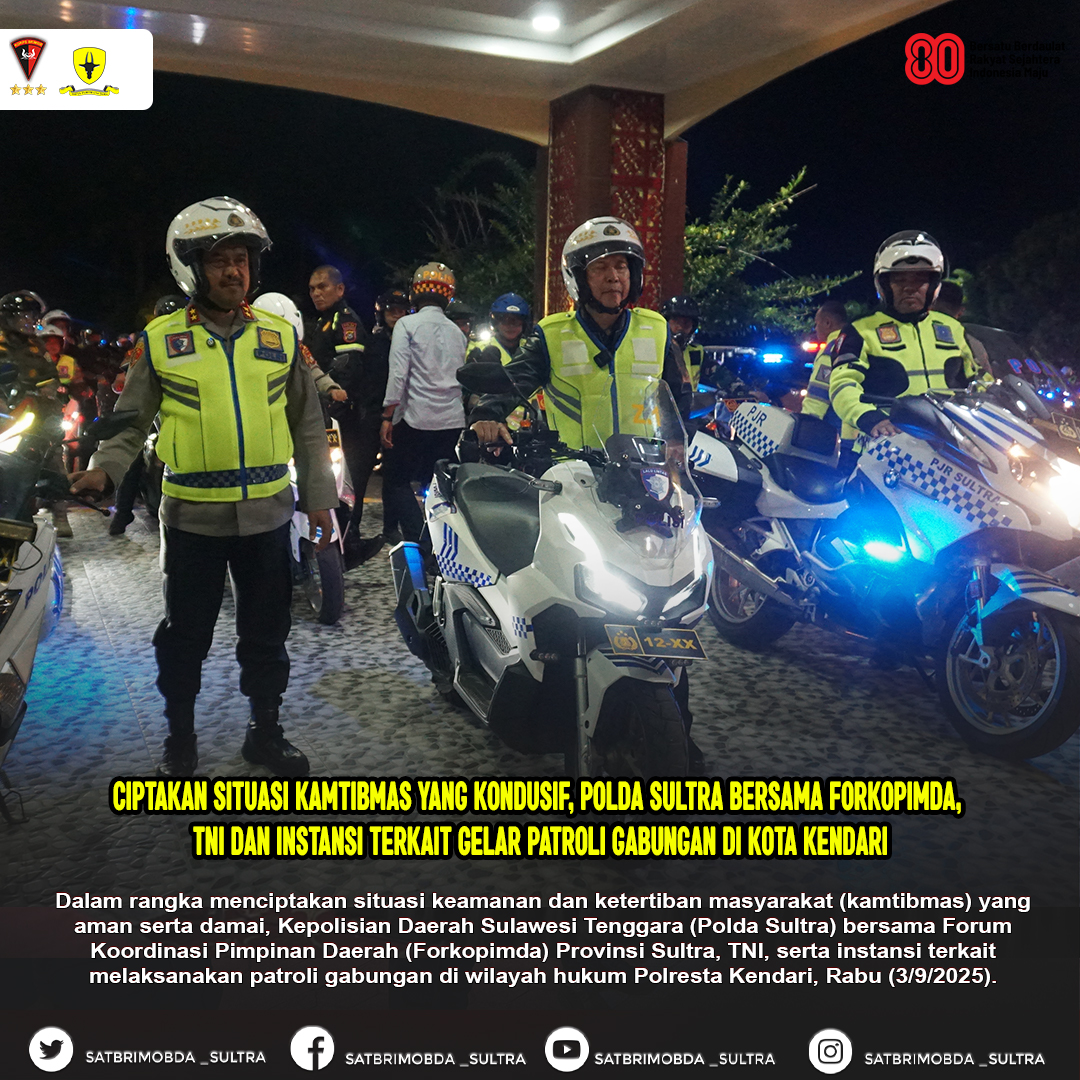 Kendari-Dalam rangka menciptakan situasi keamanan dan ketertiban masyarakat (kamtibmas) yang aman serta damai, Kepolisian Daerah Sulawesi Tenggara (Polda Sultra) bersama Forum Koordinasi Pimpinan Daerah (Forkopimda) Provinsi Sultra, TNI, serta instansi terkait melaksanakan patroli gabungan di wilayah hukum Polresta Kendari, Rabu (3/9/2025).