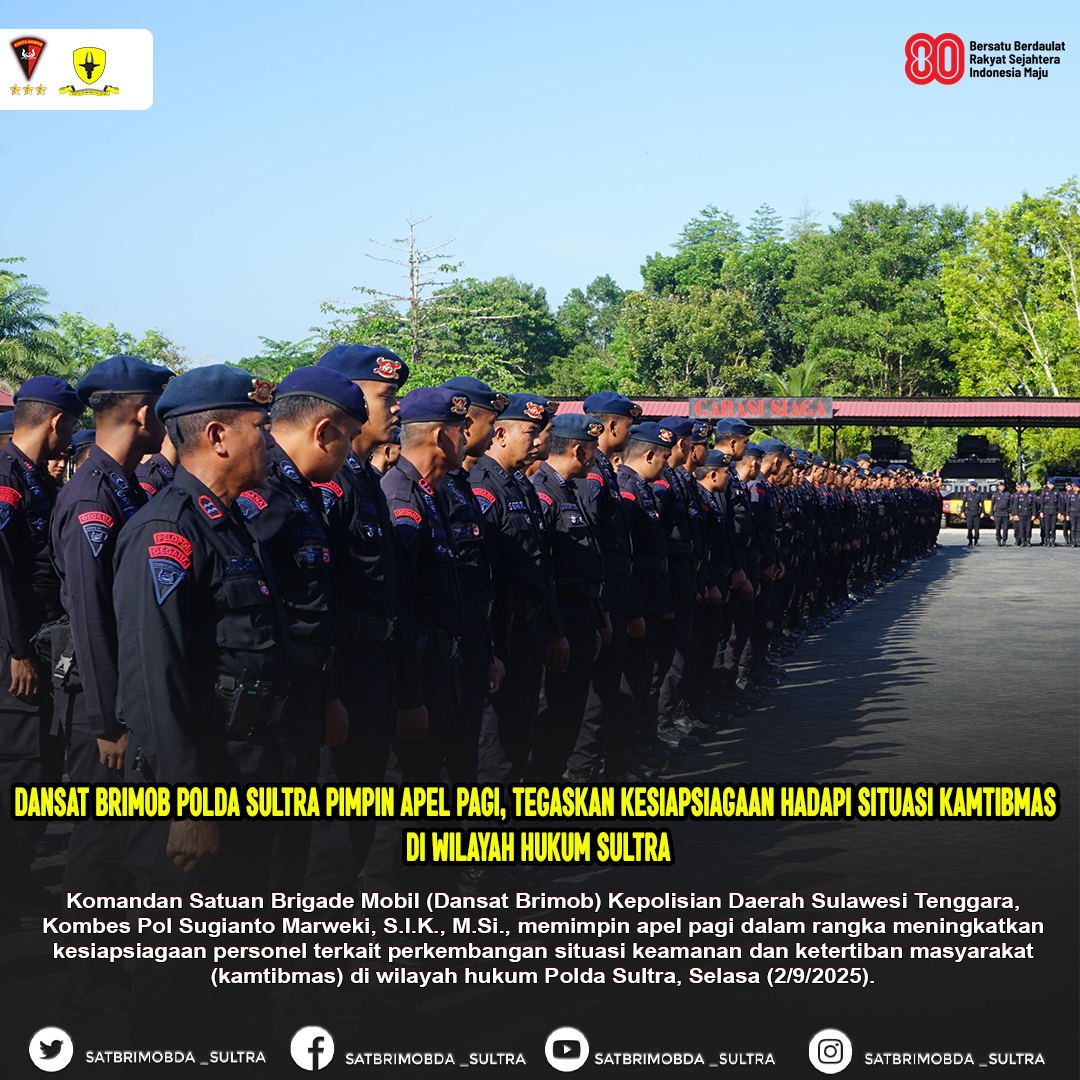 Kendari – Komandan Satuan Brigade Mobil (Dansat Brimob) Kepolisian Daerah Sulawesi Tenggara, Kombes Pol Sugianto Marweki, S.I.K., M.Si., memimpin apel pagi dalam rangka meningkatkan kesiapsiagaan personel terkait perkembangan situasi keamanan dan ketertiban masyarakat (kamtibmas) di wilayah hukum Polda Sultra, Selasa (2/9/2025).