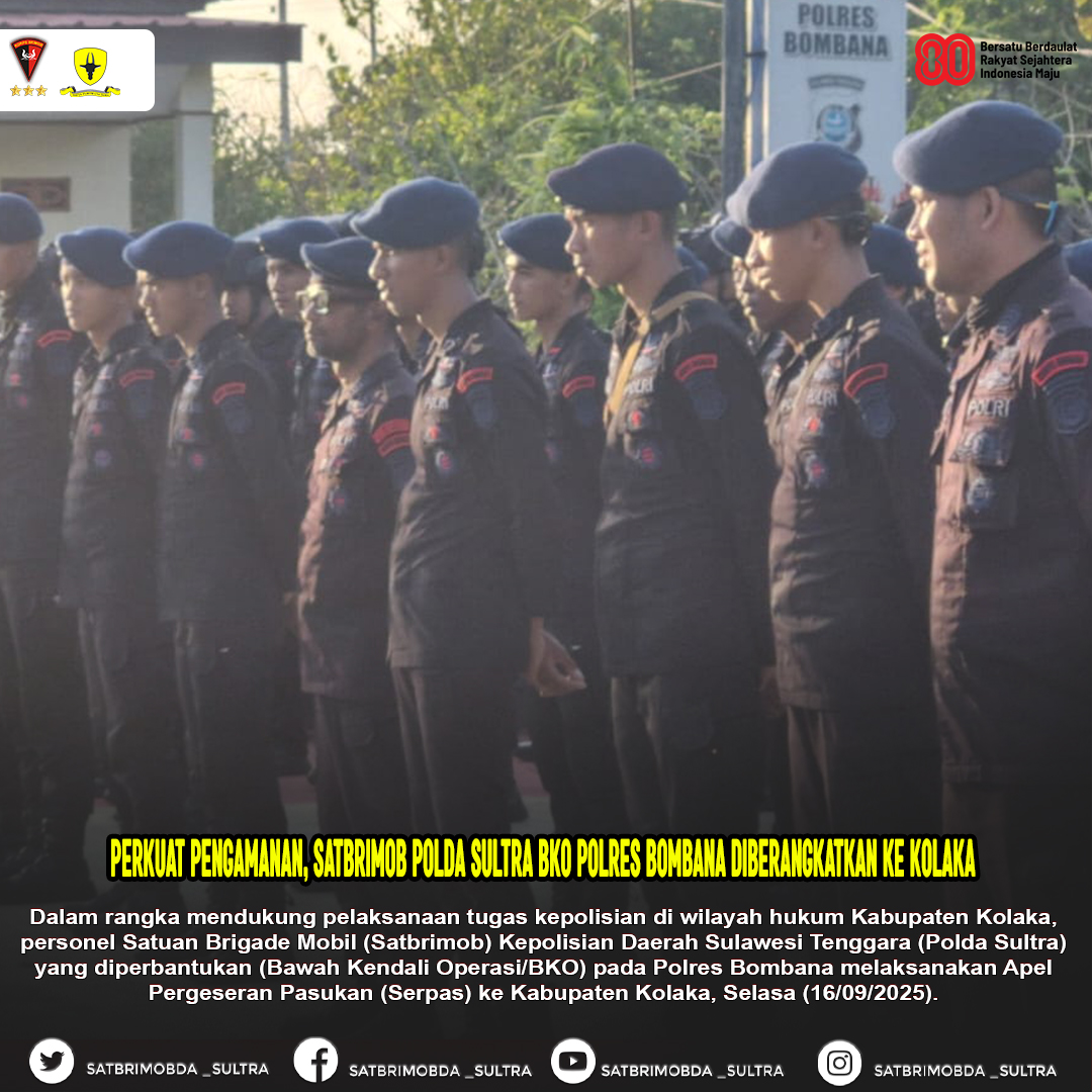 Kendari – Dalam rangka mendukung pelaksanaan tugas kepolisian di wilayah hukum Kabupaten Kolaka, personel Satuan Brigade Mobil (Satbrimob) Kepolisian Daerah Sulawesi Tenggara (Polda Sultra) yang diperbantukan (Bawah Kendali Operasi/BKO) pada Polres Bombana melaksanakan Apel Pergeseran Pasukan (Serpas) ke Kabupaten Kolaka, Selasa (16/09/2025).