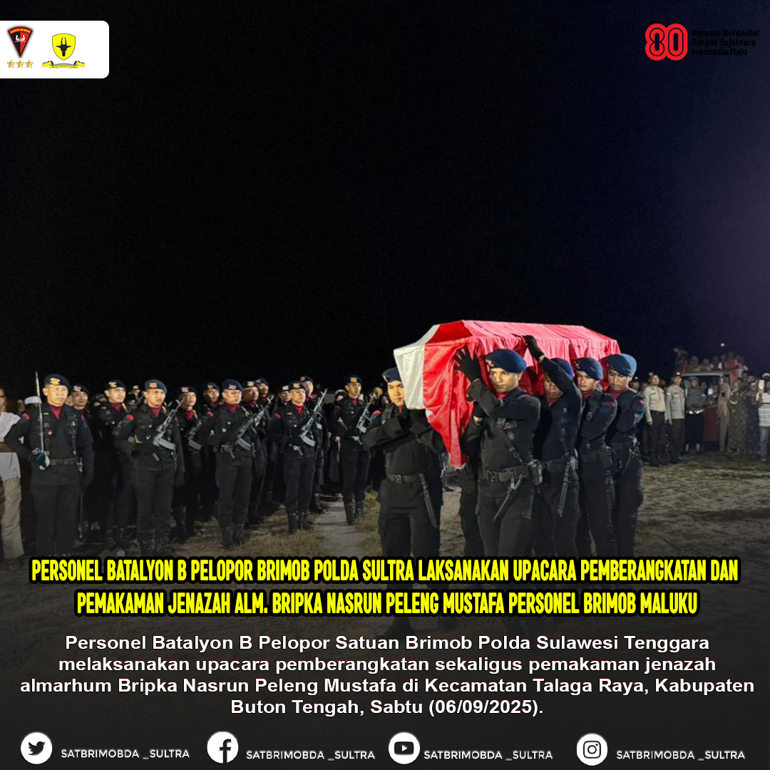 Talaga, Buton Tengah – Personel Batalyon B Pelopor Satuan Brimob Polda Sulawesi Tenggara melaksanakan upacara pemberangkatan sekaligus pemakaman jenazah almarhum Bripka Nasrun Peleng Mustafa di Kecamatan Talaga Raya, Kabupaten Buton Tengah, Sabtu (06/09/2025).