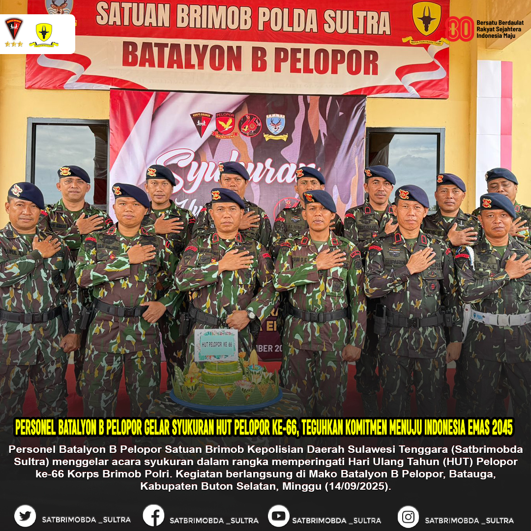 Batauga – Personel Batalyon B Pelopor Satuan Brimob Kepolisian Daerah Sulawesi Tenggara (Satbrimobda Sultra) menggelar acara syukuran dalam rangka memperingati Hari Ulang Tahun (HUT) Pelopor ke-66 Korps Brimob Polri. Kegiatan berlangsung di Mako Batalyon B Pelopor, Batauga, Kabupaten Buton Selatan, Minggu (14/09/2025).