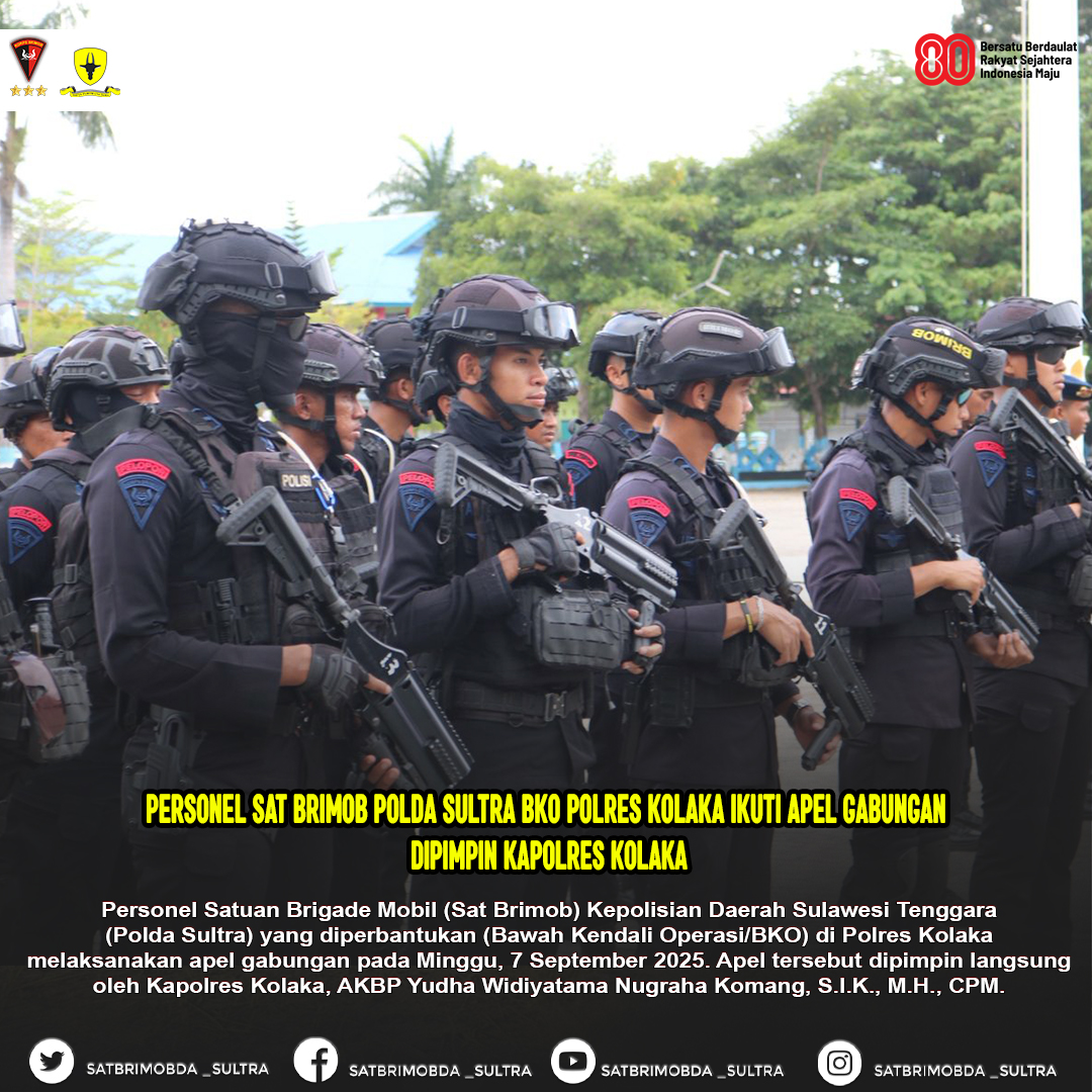 Kolaka – Personel Satuan Brigade Mobil (Sat Brimob) Kepolisian Daerah Sulawesi Tenggara (Polda Sultra) yang diperbantukan (Bawah Kendali Operasi/BKO) di Polres Kolaka melaksanakan apel gabungan pada Minggu, 7 September 2025. Apel tersebut dipimpin langsung oleh Kapolres Kolaka, AKBP Yudha Widiyatama Nugraha Komang, S.I.K., M.H., CPM.