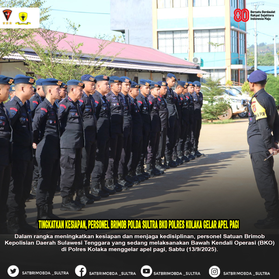 Kendari – Dalam rangka meningkatkan kesiapan dan menjaga kedisiplinan, personel Satuan Brimob Kepolisian Daerah Sulawesi Tenggara yang sedang melaksanakan Bawah Kendali Operasi (BKO) di Polres Kolaka menggelar apel pagi, Sabtu (13/9/2025).