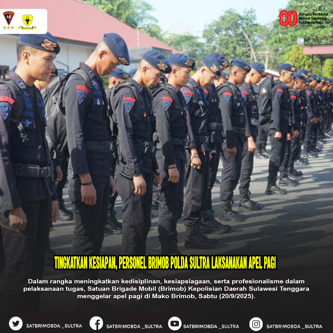 Kendari Dalam rangka meningkatkan kedisiplinan, kesiapsiagaan, serta profesionalisme dalam pelaksanaan tugas, Satuan Brigade Mobil (Brimob) Kepolisian Daerah Sulawesi Tenggara menggelar apel pagi di Mako Brimob, Sabtu (20/9/2025).