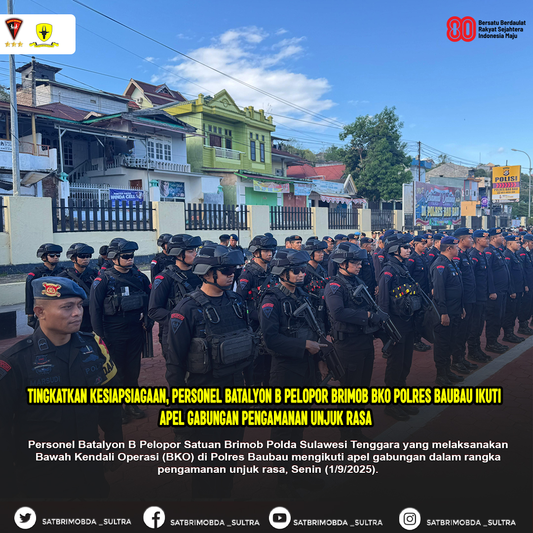Apel gabungan tersebut diikuti oleh jajaran Polres Baubau, personel Brimob Batalyon B Pelopor, serta unsur pengamanan terkait lainnya. Kehadiran personel Brimob BKO ini diharapkan dapat memperkuat pengamanan sekaligus memberikan rasa aman kepada masyarakat selama berlangsungnya unjuk rasa.