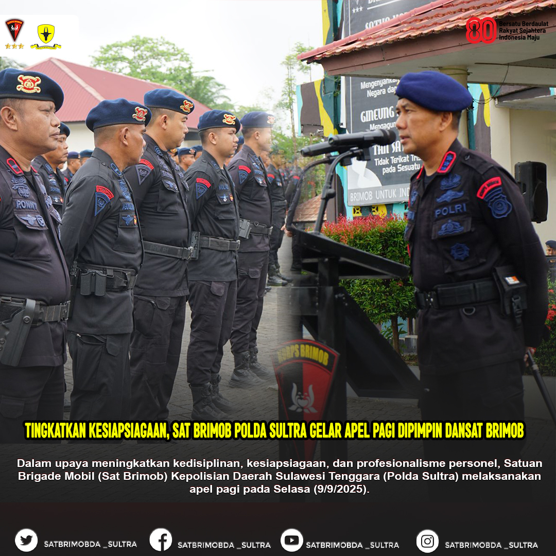 Kendari – Dalam upaya meningkatkan kedisiplinan, kesiapsiagaan, dan profesionalisme personel, Satuan Brigade Mobil (Sat Brimob) Kepolisian Daerah Sulawesi Tenggara (Polda Sultra) melaksanakan apel pagi pada Selasa (9/9/2025).