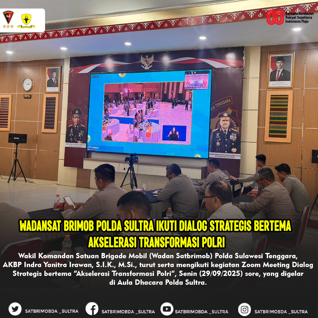 Kendari – Wakil Komandan Satuan Brigade Mobil (Wadan Satbrimob) Polda Sulawesi Tenggara, AKBP Indra Yanitra Irawan, S.I.K., M.Si., turut serta mengikuti kegiatan Zoom Meeting Dialog Strategis bertema “Akselerasi Transformasi Polri”, Senin (29/09/2025) sore, yang digelar di Aula Dhacara Polda Sultra.