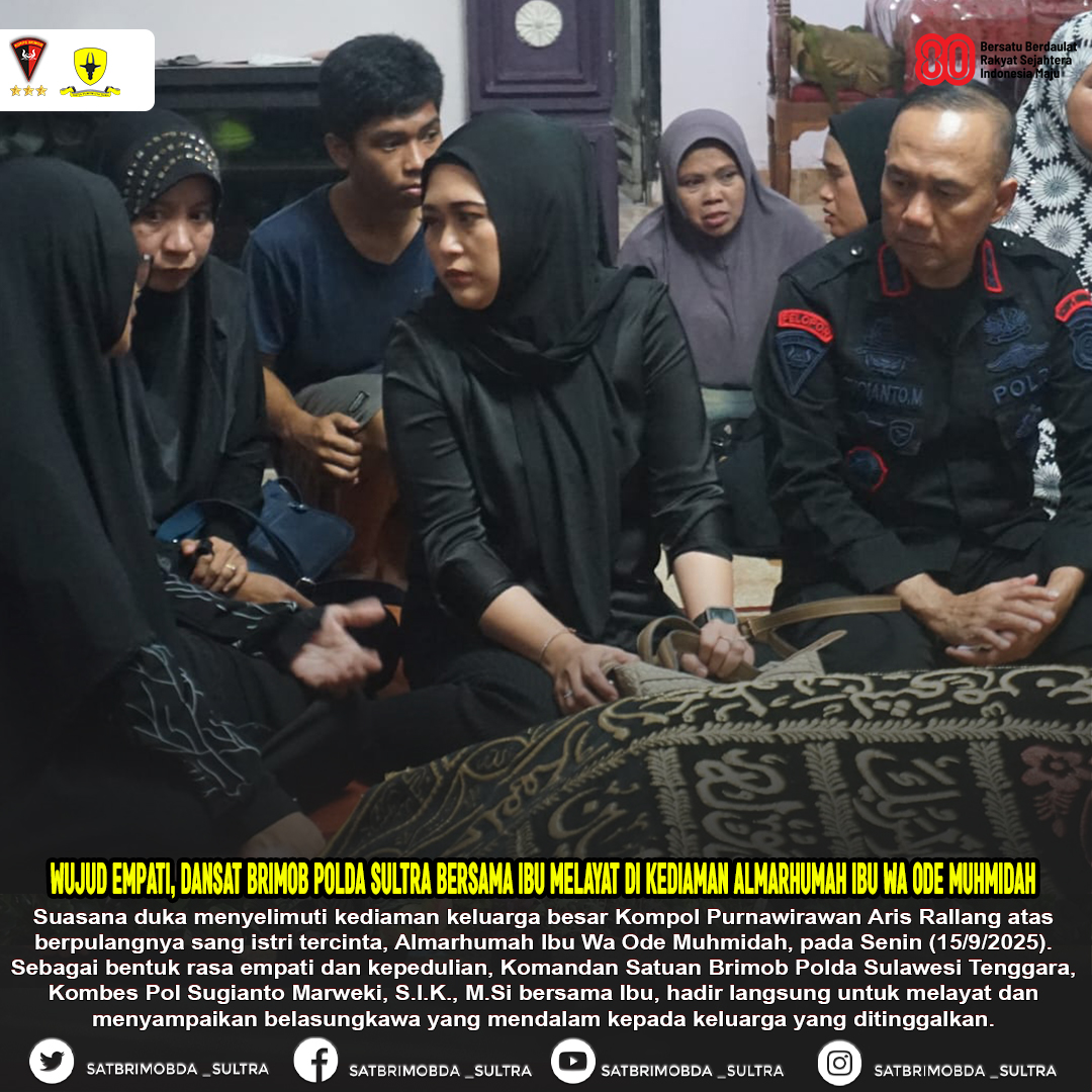 “Atas nama keluarga besar Satuan Brimob Polda Sulawesi Tenggara, kami turut berduka cita yang sedalam-dalamnya. Semoga almarhumah husnul khatimah, dan keluarga diberi kekuatan dalam menghadapi cobaan ini,” ujar Kombes Pol Sugianto Marweki, S.I.K., M.Si.