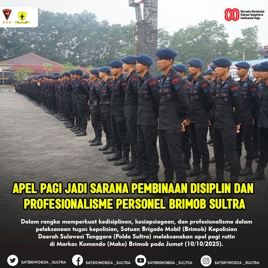 Kendari – Dalam rangka memperkuat kedisiplinan, kesiapsiagaan, dan profesionalisme dalam pelaksanaan tugas kepolisian, Satuan Brigade Mobil (Brimob) Kepolisian Daerah Sulawesi Tenggara (Polda Sultra) melaksanakan apel pagi rutin di Markas Komando (Mako) Brimob pada Jumat (10/10/2025).