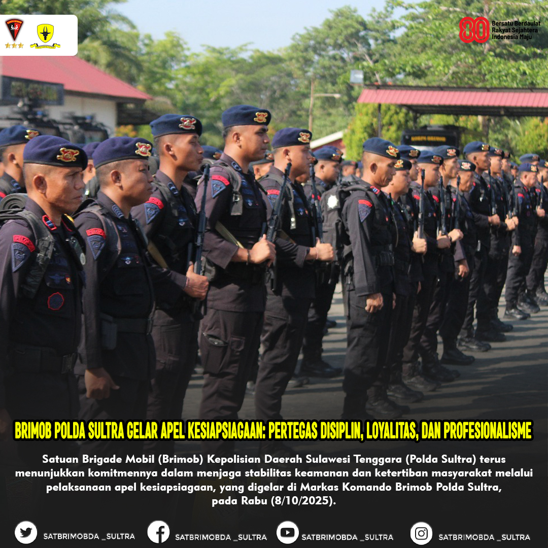 Kendari – Satuan Brigade Mobil (Brimob) Kepolisian Daerah Sulawesi Tenggara (Polda Sultra) terus menunjukkan komitmennya dalam menjaga stabilitas keamanan dan ketertiban masyarakat melalui pelaksanaan apel kesiapsiagaan, yang digelar di Markas Komando Brimob Polda Sultra, pada Rabu (8/10/2025).