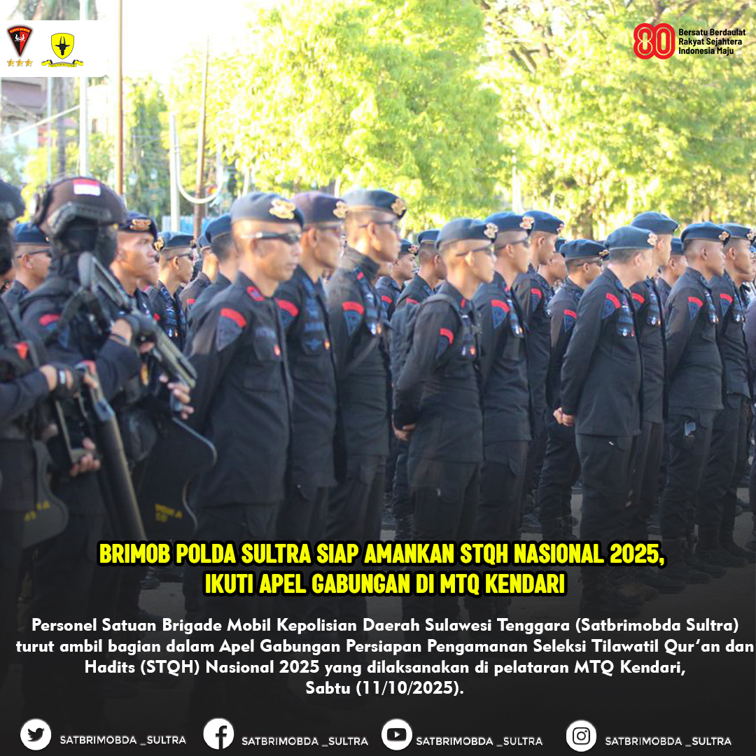 Kendari –Personel Satuan Brigade Mobil Kepolisian Daerah Sulawesi Tenggara (Satbrimobda Sultra) turut ambil bagian dalam Apel Gabungan Persiapan Pengamanan Seleksi Tilawatil Qur’an dan Hadits (STQH) Nasional 2025 yang dilaksanakan di pelataran MTQ Kendari, Sabtu (11/10/2025).
