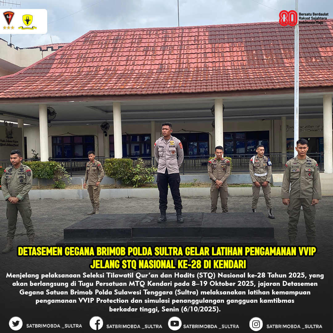 Kendari – Menjelang pelaksanaan Seleksi Tilawatil Qur’an dan Hadits (STQ) Nasional ke-28 Tahun 2025, yang akan berlangsung di Tugu Persatuan MTQ Kendari pada 8–19 Oktober 2025, jajaran Detasemen Gegana Satuan Brimob Polda Sulawesi Tenggara (Sultra) melaksanakan latihan kemampuan pengamanan VVIP Protection dan simulasi penanggulangan gangguan kamtibmas berkadar tinggi, Senin (6/10/2025).