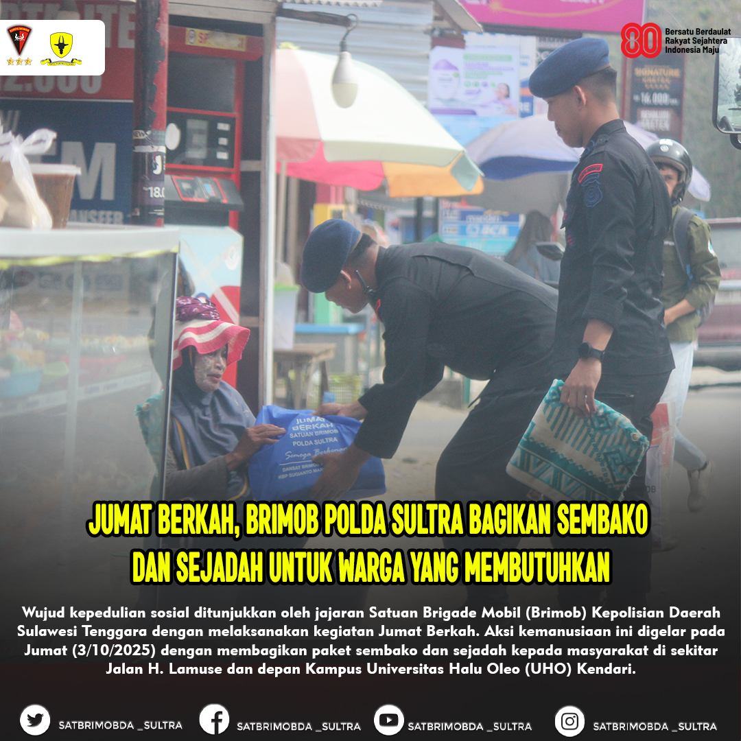 Kendari – Wujud kepedulian sosial ditunjukkan oleh jajaran Satuan Brigade Mobil (Brimob) Kepolisian Daerah Sulawesi Tenggara dengan melaksanakan kegiatan Jumat Berkah. Aksi kemanusiaan ini digelar pada Jumat (3/10/2025) dengan membagikan paket sembako dan sejadah kepada masyarakat di sekitar Jalan H. Lamuse dan depan Kampus Universitas Halu Oleo (UHO) Kendari.