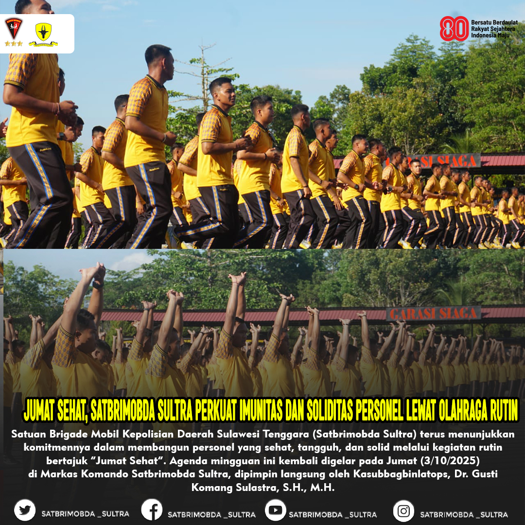 Kegiatan Jumat Sehat merupakan bagian dari program pembinaan sumber daya manusia Satbrimobda Sultra yang berkesinambungan. Hal ini sejalan dengan nilai luhur Korps Brimob Polri, yaitu “Brimob Untuk Nusa dan Bangsa,” sekaligus mendukung visi Polri dalam mencetak SDM unggul guna mewujudkan Indonesia Emas 2045.