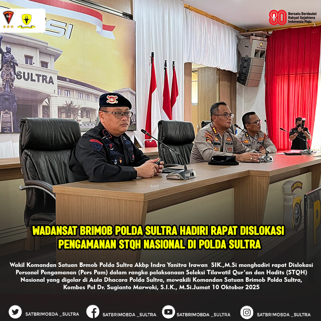 Kendari –Wakil Komandan Satuan Brmob Polda Sultra Akbp Indra Yanitra Irawan SIK.,M.Si menghadiri rapat Dislokasi Personel Pengamanan (Pers Pam) dalam rangka pelaksanaan Seleksi Tilawatil Qur’an dan Hadits (STQH) Nasional yang digelar di Aula Dhacara Polda Sultra, mewakili Komandan Satuan (Dansat) Brimob Polda Sultra.Jumat 10 Oktober 2025