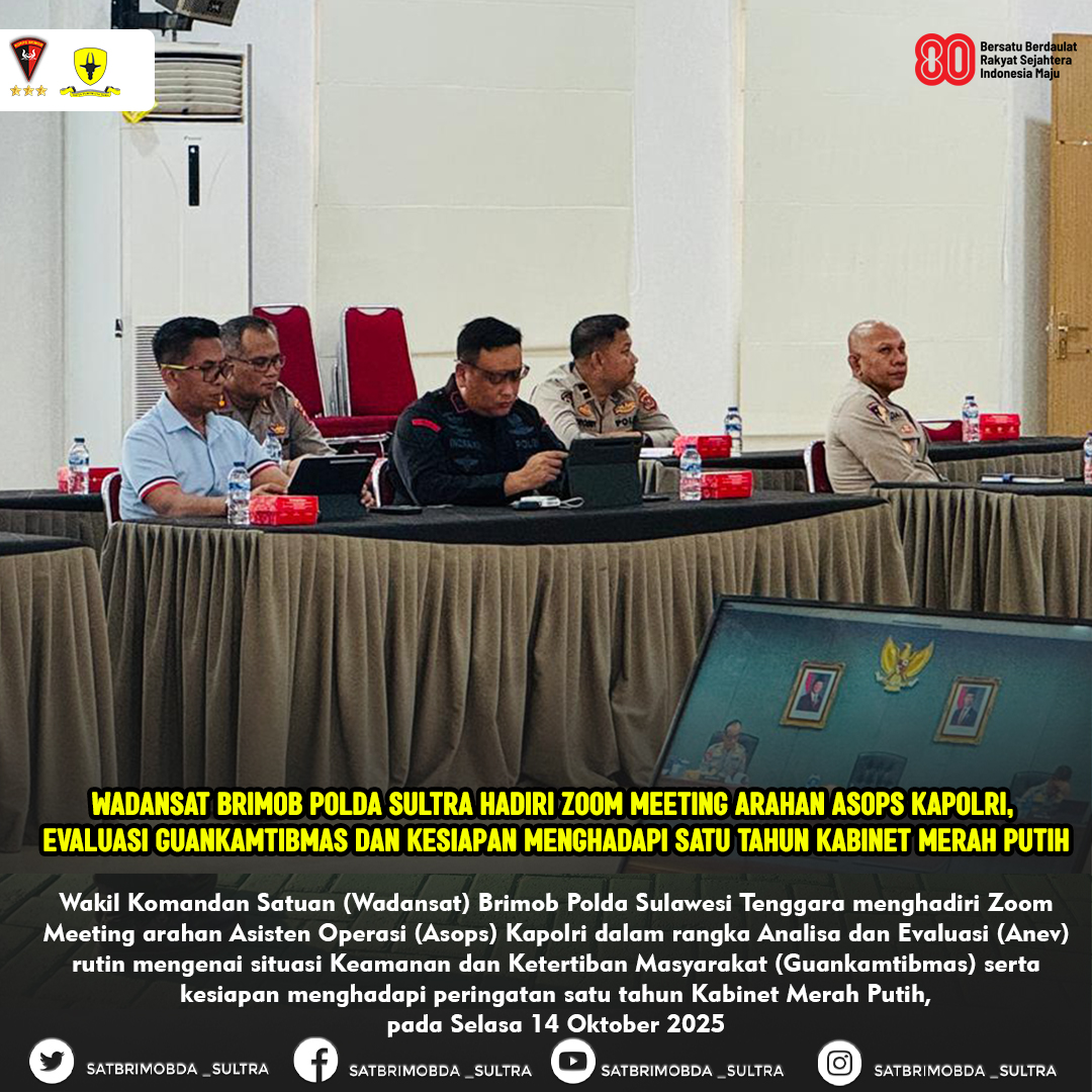 Kendari – Wakil Komandan Satuan (Wadansat) Brimob Polda Sulawesi Tenggara menghadiri Zoom Meeting arahan Asisten Operasi (Asops) Kapolri dalam rangka Analisa dan Evaluasi (Anev) rutin mengenai situasi Keamanan dan Ketertiban Masyarakat (Guankamtibmas) serta kesiapan menghadapi peringatan satu tahun Kabinet Merah Putih, pada Senin malam, 13 Oktober 2025.