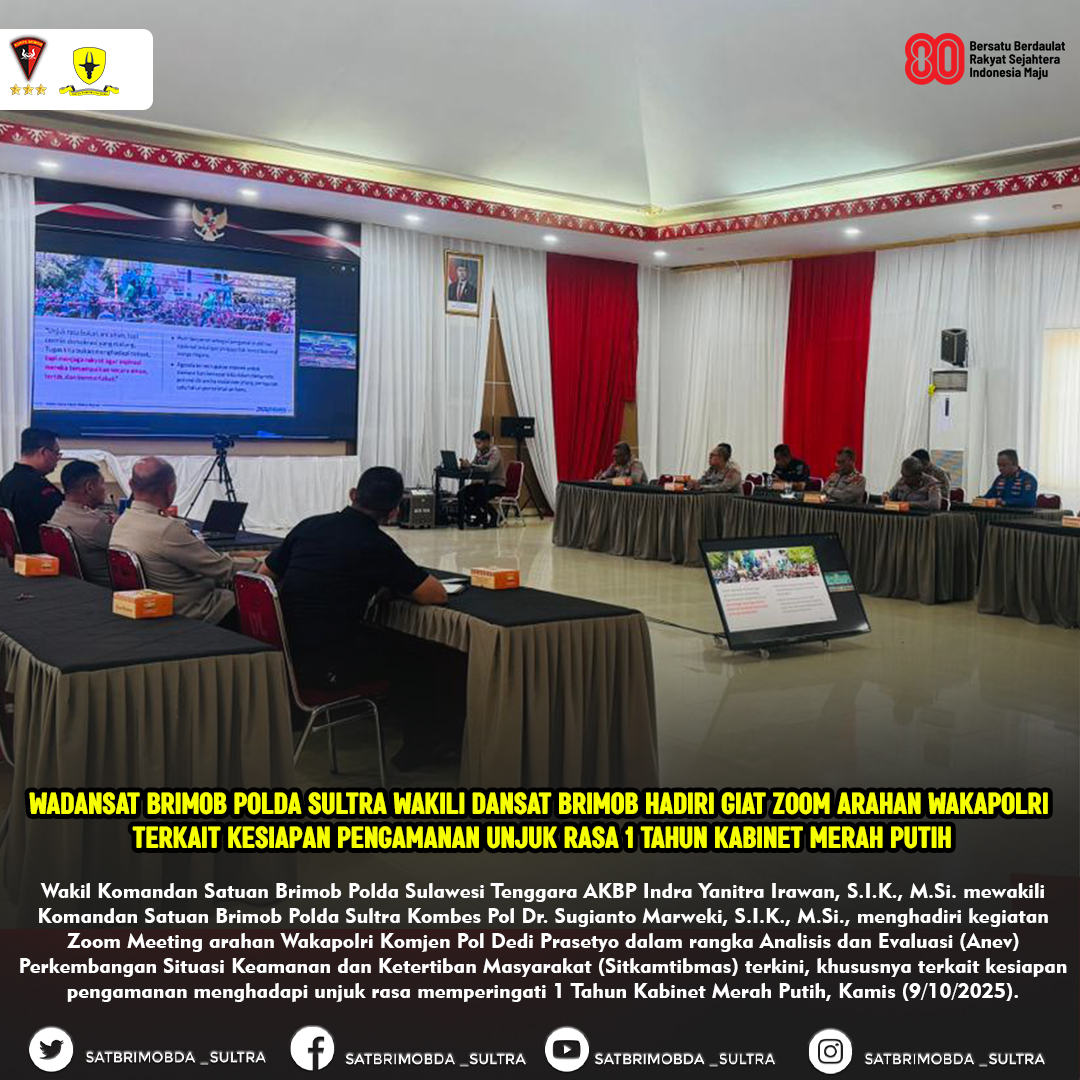 Kendari – Wakil Komandan Satuan Brimob Polda Sulawesi Tenggara AKBP Indra Yanitra Irawan, S.I.K., M.Si. mewakili Komandan Satuan Brimob Polda Sultra Kombes Pol Dr. Sugianto Marweki, S.I.K., M.Si., menghadiri kegiatan Zoom Meeting arahan Wakapolri Komjen Pol Dedi Prasetyo dalam rangka Analisis dan Evaluasi (Anev) Perkembangan Situasi Keamanan dan Ketertiban Masyarakat (Sitkamtibmas) terkini, khususnya terkait kesiapan pengamanan menghadapi unjuk rasa memperingati 1 Tahun Kabinet Merah Putih, Kamis (9/10/2025).