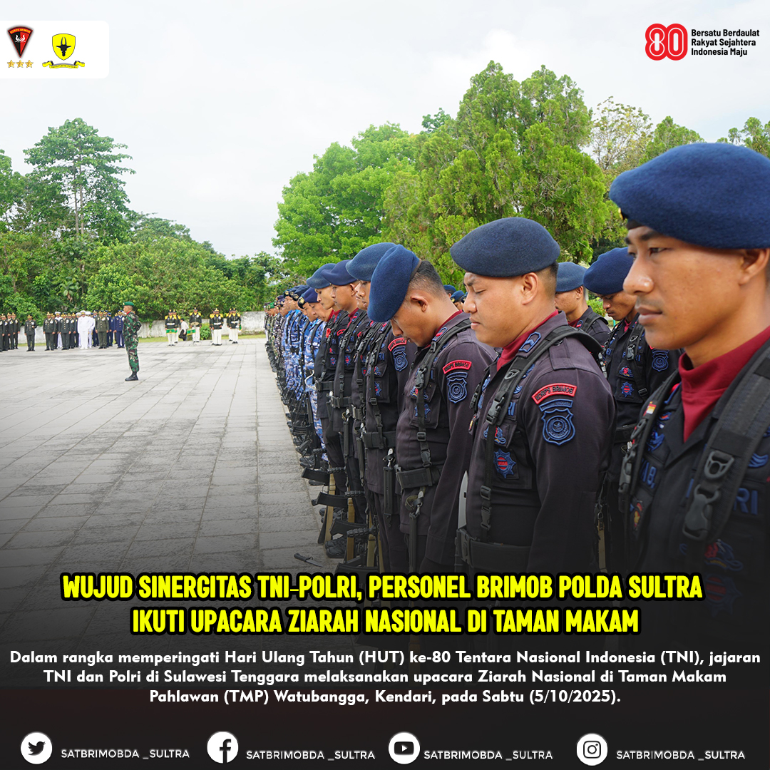 Kendari – Dalam rangka memperingati Hari Ulang Tahun (HUT) ke-80 Tentara Nasional Indonesia (TNI), jajaran TNI dan Polri di Sulawesi Tenggara melaksanakan upacara Ziarah Nasional di Taman Makam Pahlawan (TMP) Watubangga, Kendari, pada Sabtu (5/10/2025).