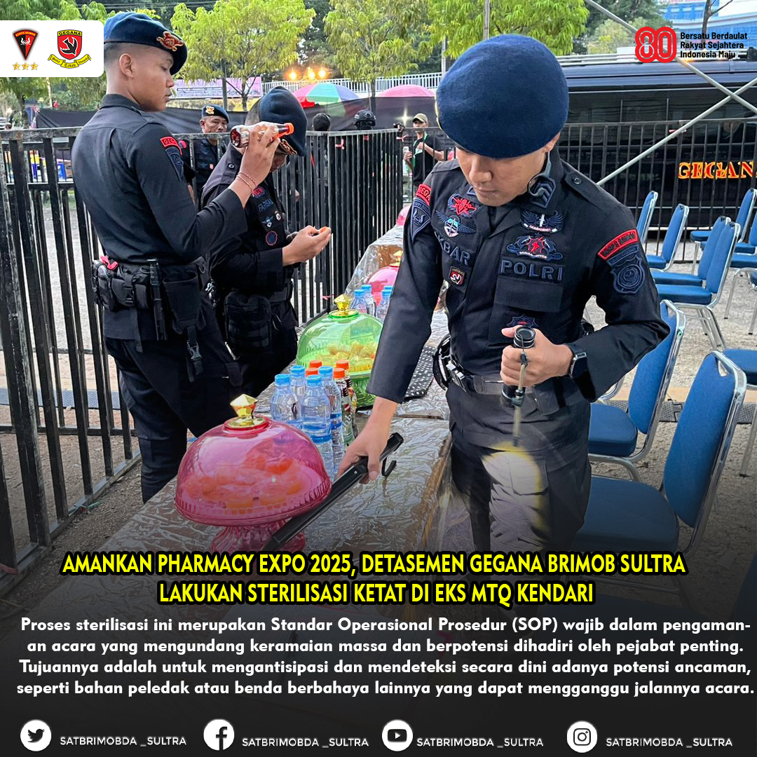KENDARI – Detasemen Gegana Satuan Brimob (Satbrimob) Polda Sultra melaksanakan sterilisasi dan pengamanan ketat di Pelataran Eks MTQ, yang berlokasi tepat di depan Taman Walikota Kendari, pada Sabtu (1/11/2025). Kegiatan ini dilakukan untuk menjamin keamanan dan kelancaran jelang digelarnya acara “Pharmacy Expo 2025”.
