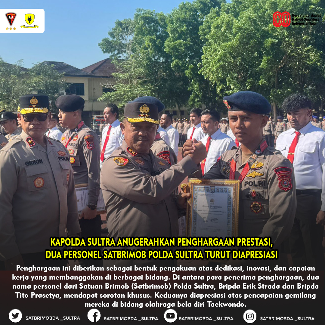 Penghargaan ini diberikan sebagai bentuk pengakuan atas dedikasi, inovasi, dan capaian kerja yang membanggakan di berbagai bidang. Di antara para penerima penghargaan, dua nama personel dari Satuan Brimob (Satbrimob) Polda Sultra, Bripda Erik Strada dan Bripda Tito Prasetya, mendapat sorotan khusus. Keduanya diapresiasi atas pencapaian gemilang mereka di bidang olahraga bela diri Taekwondo, yang telah sukses mengharumkan nama institusi Polda Sultra di tingkat kompetisi.