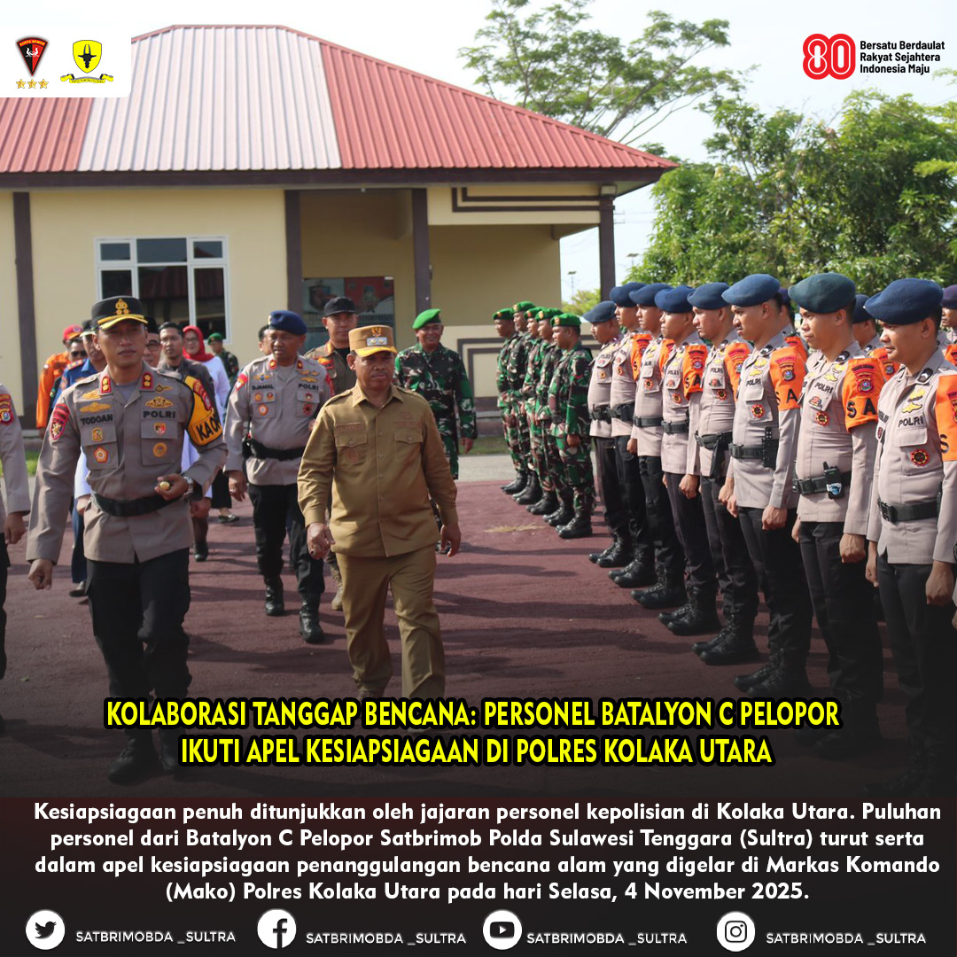 Kolaka Utara, SULTRA – Kesiapsiagaan penuh ditunjukkan oleh jajaran personel kepolisian di Kolaka Utara. Puluhan personel dari Batalyon C Pelopor Satbrimob Polda Sulawesi Tenggara (Sultra) turut serta dalam apel kesiapsiagaan penanggulangan bencana alam yang digelar di Markas Komando (Mako) Polres Kolaka Utara pada hari Selasa, 4 November 2025.