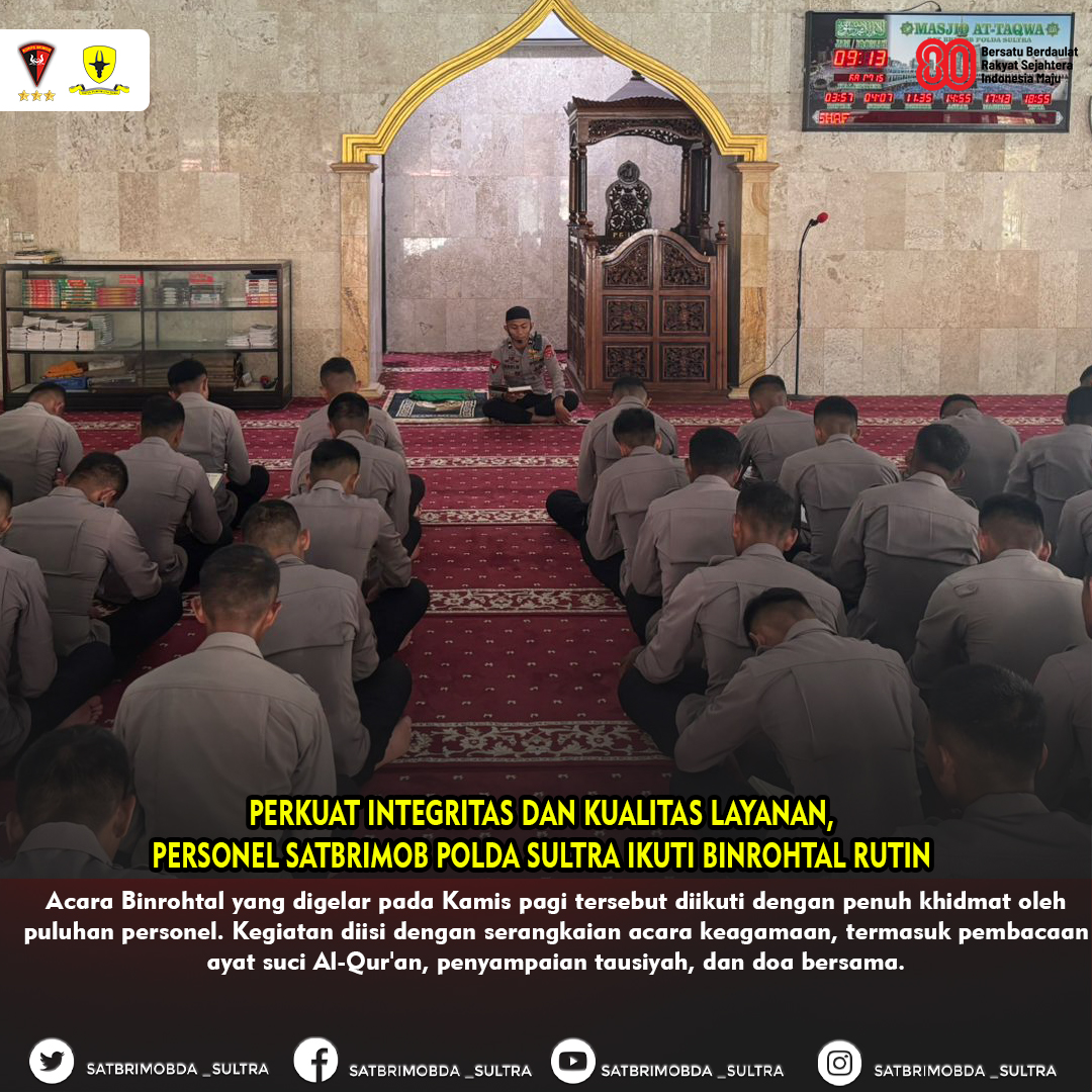 KENDARI – Satuan Brigade Mobil (Satbrimob) Kepolisian Daerah Sulawesi Tenggara (Polda Sultra) kembali melaksanakan kegiatan Pembinaan Rohani dan Mental (Binrohtal) rutin bagi seluruh personel yang beragama Islam. Kegiatan ini dipusatkan di Masjid At-Taqwa Mako Satbrimob Polda Sultra dan bertujuan utama untuk memperkuat keimanan, ketakwaan, serta integritas moral personel dalam menjalankan tugas.