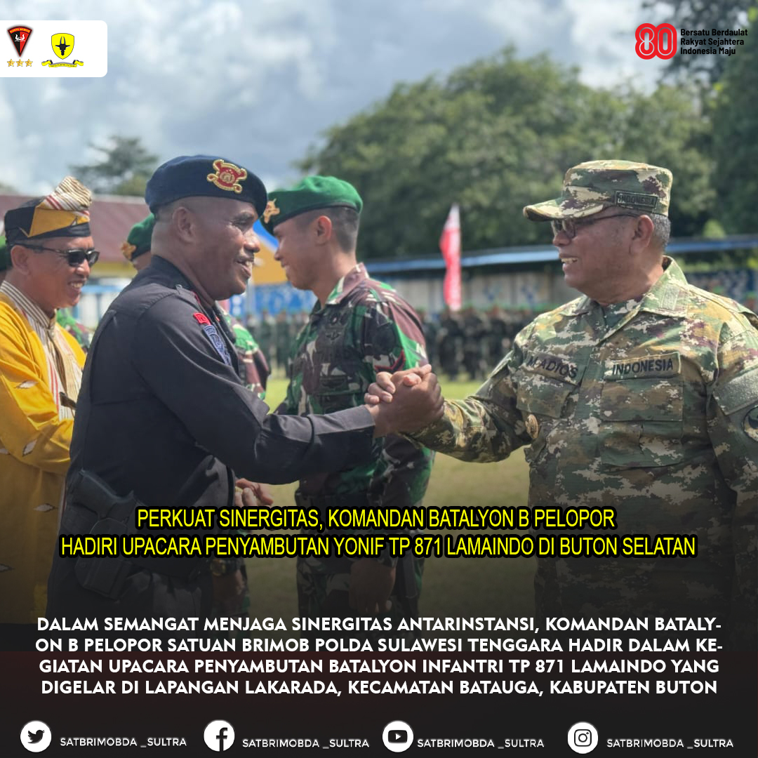 Dalam semangat menjaga sinergitas antarinstansi, Komandan Batalyon B Pelopor Satuan Brimob Polda Sulawesi Tenggara hadir dalam kegiatan Upacara Penyambutan Batalyon Infantri TP 871 Lamaindo yang digelar di Lapangan Lakarada, Kecamatan Batauga, Kabupaten Buton Selatan, Sabtu 22 November. Kegiatan tersebut berlangsung khidmat dan penuh semangat kebersamaan sebagai wujud kekompakan TNI-Polri di wilayah Sulawesi Tenggara.