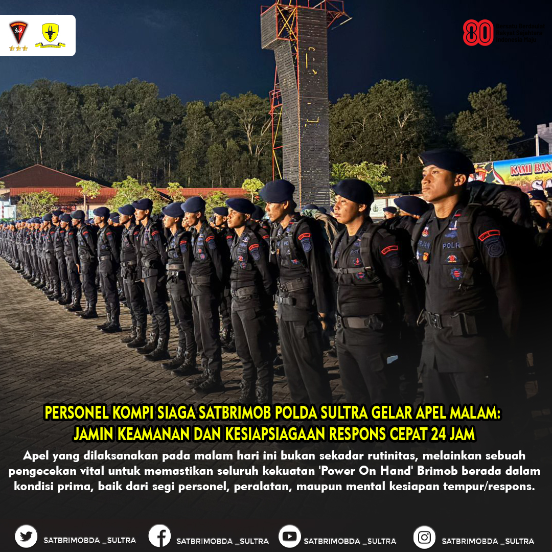 Kesiapsiagaan di malam hari menjadi sangat krusial karena aktivitas patroli dan pengamanan berlanjut hingga dini hari. Melalui apel ini, personel Satbrimob Polda Sultra berkomitmen untuk memberikan jaminan rasa aman bagi warga yang beristirahat, sekaligus menunjukkan kehadiran negara dalam menjaga stabilitas wilayah.