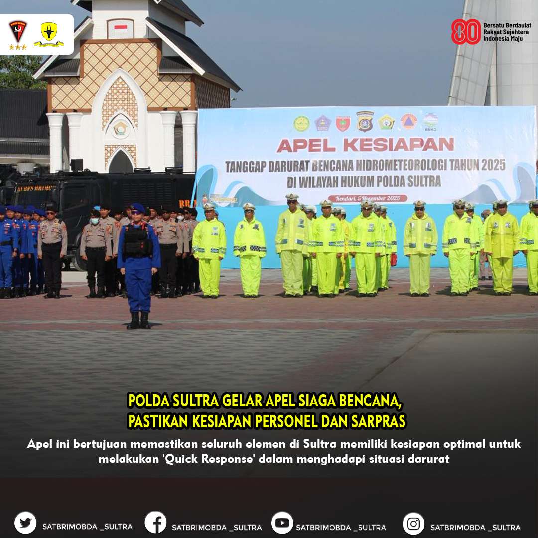 KENDARI – Kepolisian Daerah Sulawesi Tenggara (Polda Sultra) menggelar Apel Kesiapan Tanggap Darurat Bencana Hidrometeorologi Tahun 2025 pada hari ini, menegaskan komitmen seluruh elemen di Sultra untuk menghadapi potensi bencana alam dengan kesiapsiagaan maksimal.