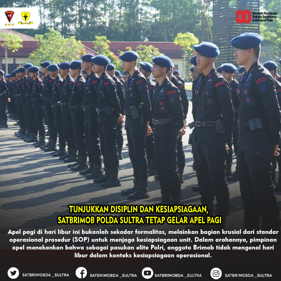 Kegiatan apel pagi di hari libur ini menegaskan komitmen Satbrimob Polda Sultra sebagai unit yang selalu siap operasional (siaga). Setelah apel, personel tidak lantas bersantai, melainkan melanjutkan dengan kegiatan pemeliharaan dan perawatan (harwat) peralatan serta latihan ringan untuk menjaga kebugaran fisik, siap digerakkan kapan pun negara membutuhkan.