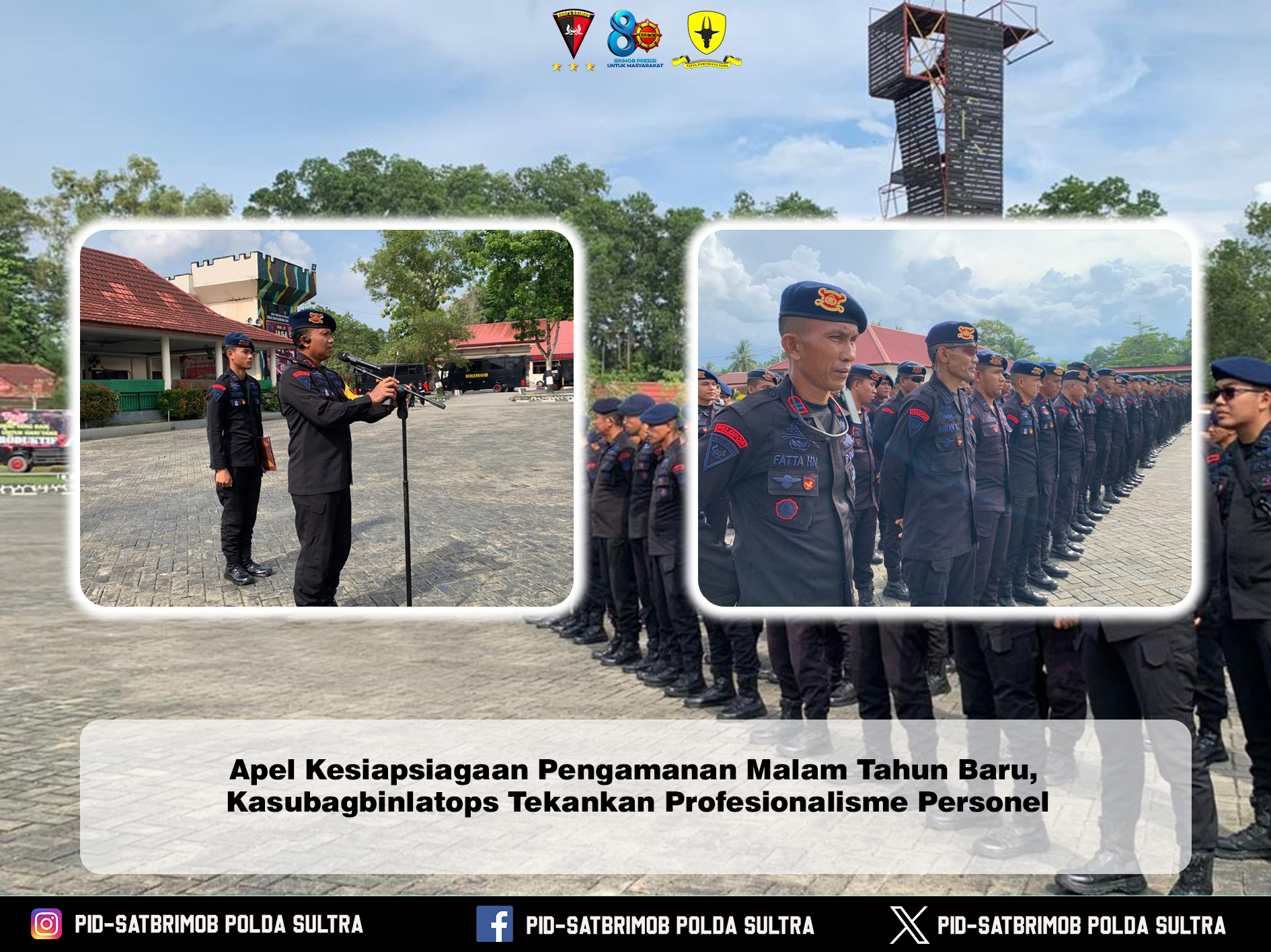 Dalam rangka memastikan kesiapan personel dan kelancaran pelaksanaan pengamanan malam pergantian Tahun Baru, Apel dipimpin oleh Kasubagbinlatops Satbrimobda Sultra, Kompol Dr. Gusti Komang Sulastra, S.H., M.H.