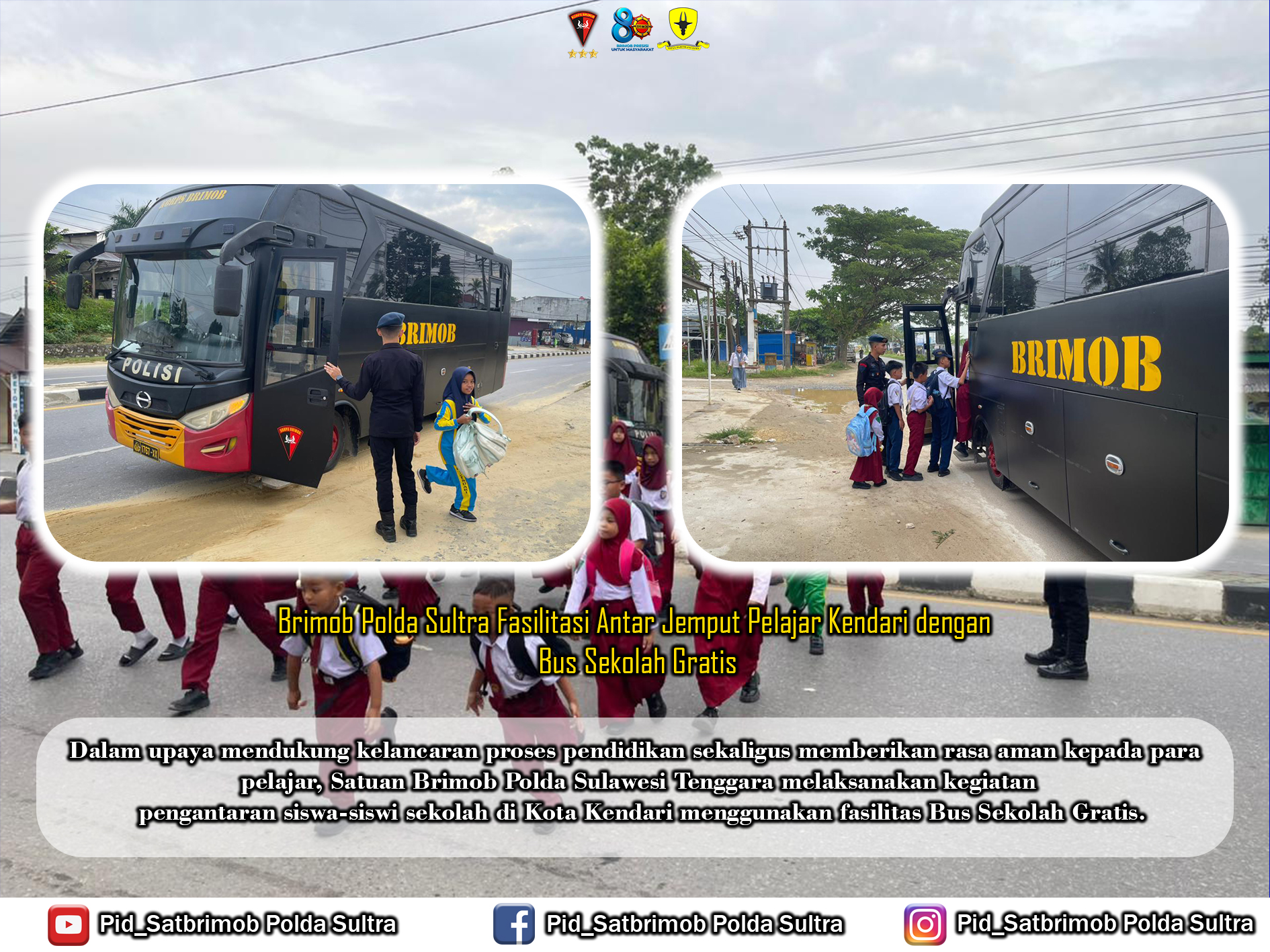 Dalam upaya mendukung kelancaran proses pendidikan sekaligus memberikan rasa aman kepada para pelajar, Satuan Brimob Polda Sulawesi Tenggara melaksanakan kegiatan pengantaran siswa-siswi sekolah di Kota Kendari menggunakan fasilitas Bus Sekolah Gratis. Program ini menjadi salah satu wujud nyata kepedulian Brimob terhadap kebutuhan transportasi para pelajar, khususnya pada jam-jam masuk sekolah.